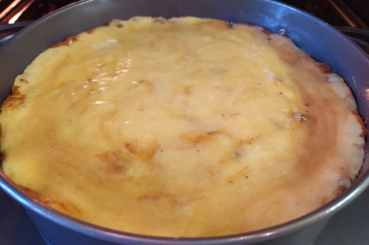 7. Сверху закрыть оставшимся тестом. Выпекать в духовке 1,5 часа при температуре 150°.