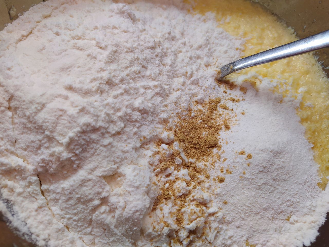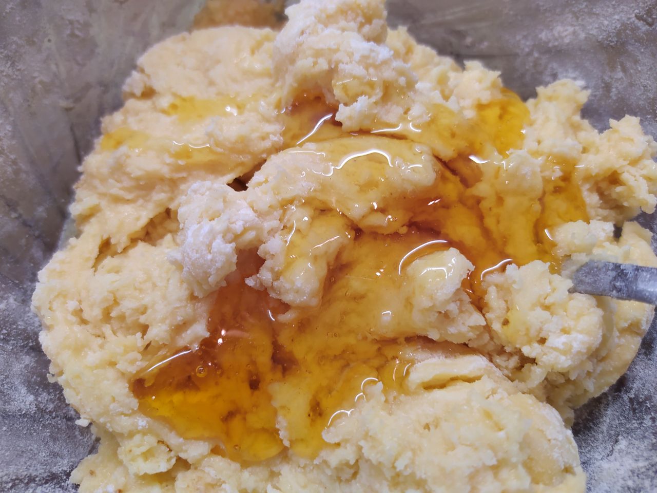 4. Добавить муку, разрыхлитель и молотый имбирь, мёд. Тщательно перемешать.