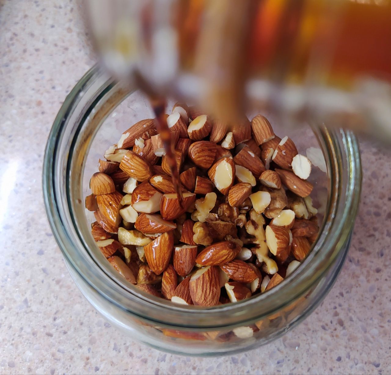 2. Выложить орехи и сухофрукты в стеклянную ёмкость, добавить пряности, залить бальзамом. Тщательно перемешать и поставить в холодильник настаиваться на один–три дня. Каждый день ёмкость необходимо встряхивать.