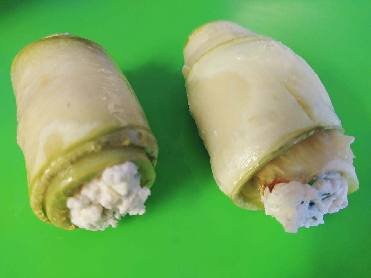 На каждый кусочек кабачка выложить начинку и завернуть рулетик.