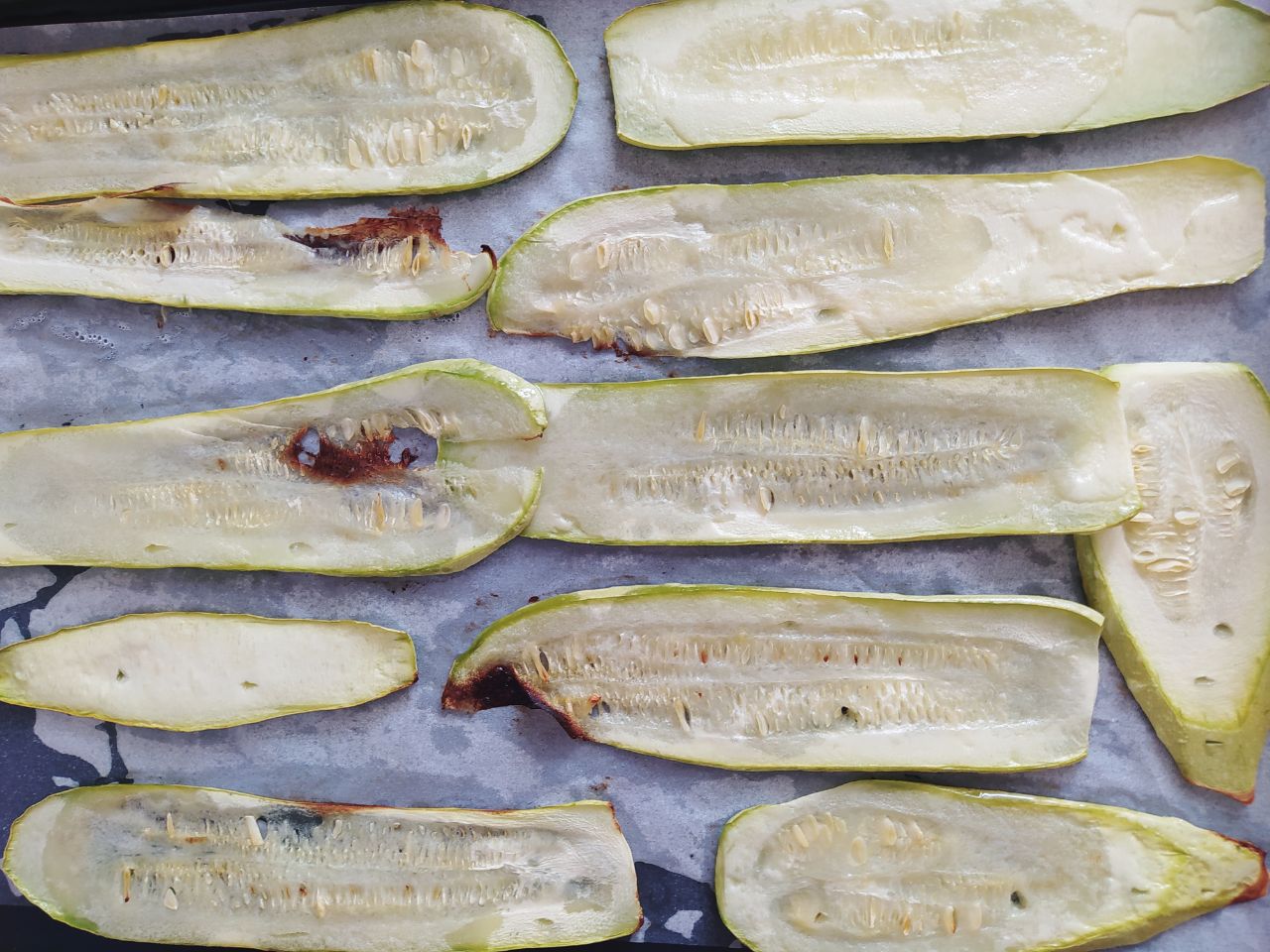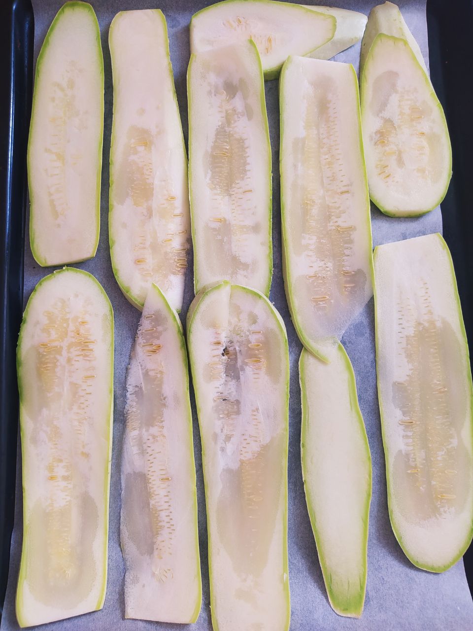 Застелить противень пергаментом, выложить кабачок и запекать его при 180 градусах в течение 25-30 минут.