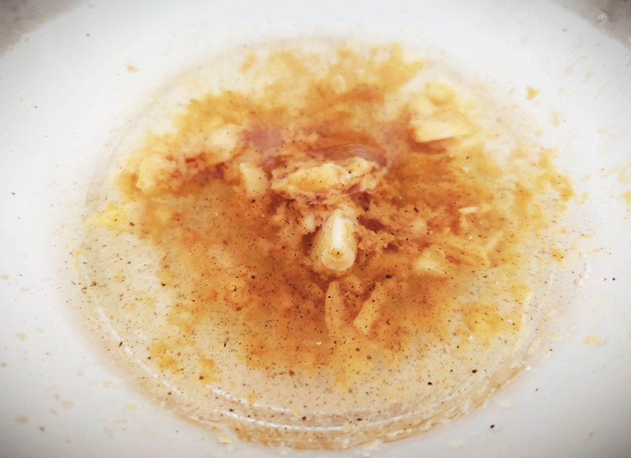 1. Начнём с маринада. В глубокой тарелке смешать растительное масло, рубленный зубчик чеснока, горчицу, перец, соль.