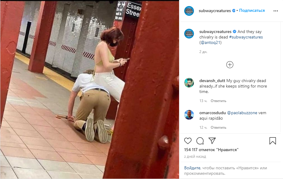 На этот ролик обратило внимание сообщество в Instagram subwaycreatures, которое опубликовало фото с этих съемок. На кадрах девушка сидит на спине парня и как будто занята своими делами.