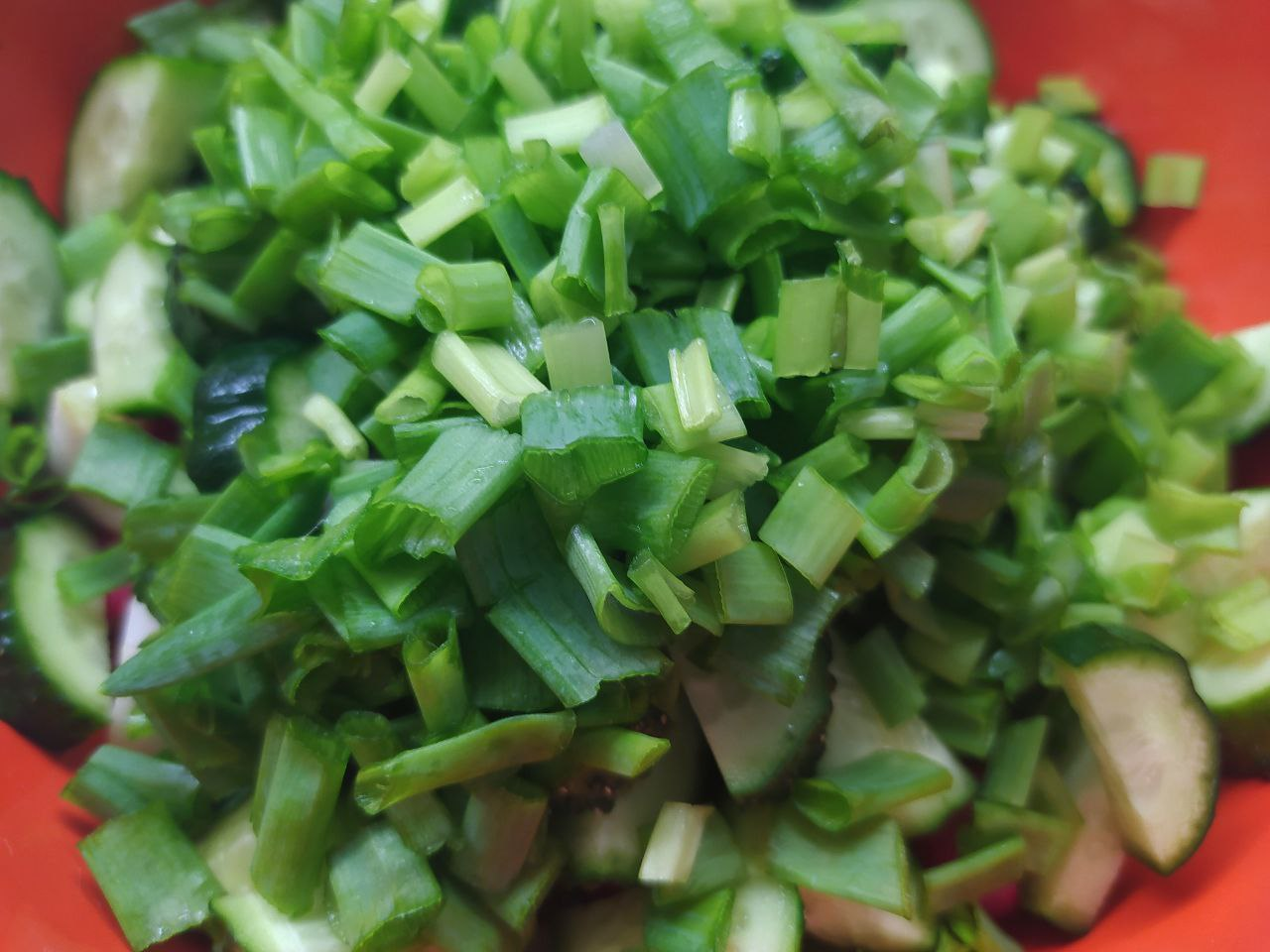 2. Огурцы вымыть, просушить и нарезать на кусочки среднего размера. Далее мелко нарезать перья лука.