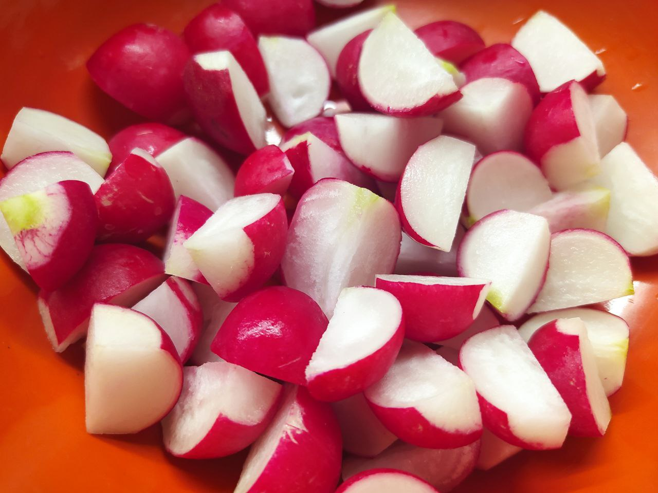1. Редиску вымыть, просушить и нарезать на 4 части.