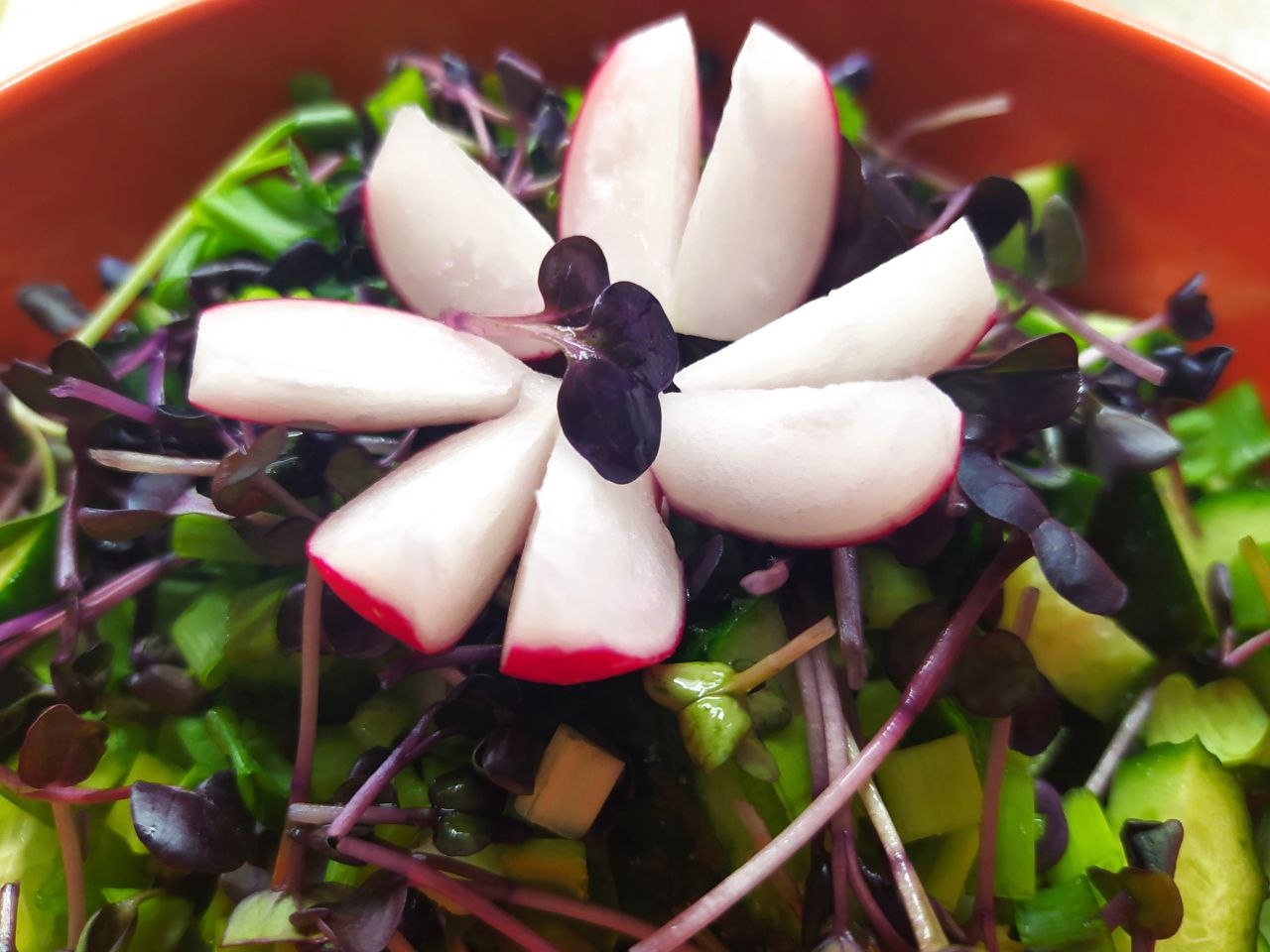 С наступлением весны одним из самых популярных овощей на нашем столе становится редиска – яркая и хрустящая, обладающая пикантным вкусом. Редиска содержит витамин С и обладает антиоксидантным действием. Так что включать её в рацион не просто можно, но и нужно. Предлагаю приготовить из редиски салат, а её антиоксидантное действие усилить за счёт добавления микрозелени.