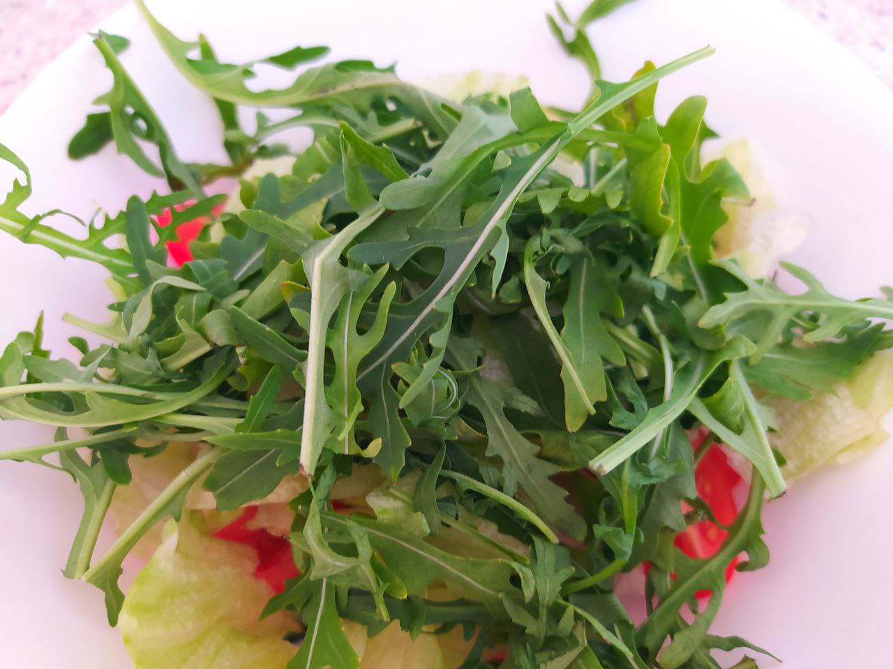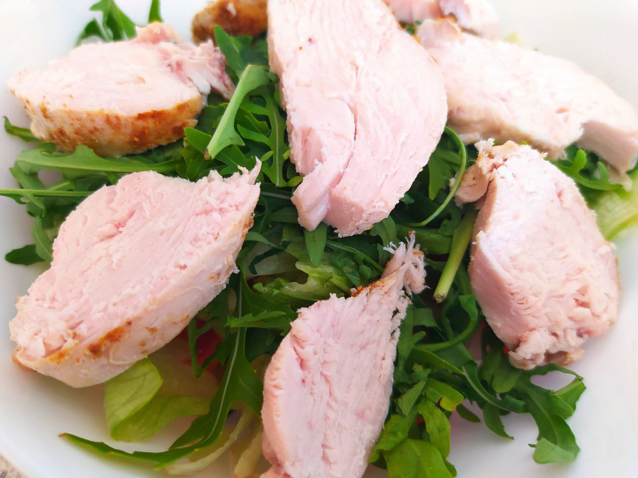 3. Куриное филе сварить, остудить, нарезать поперек волокон на небольшие кусочки и выложить поверх рукколы.