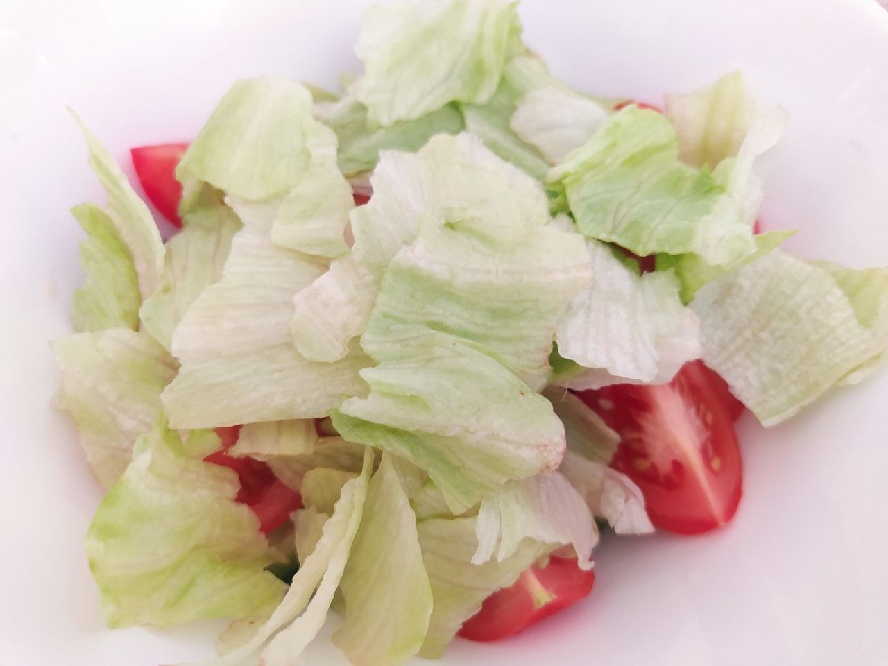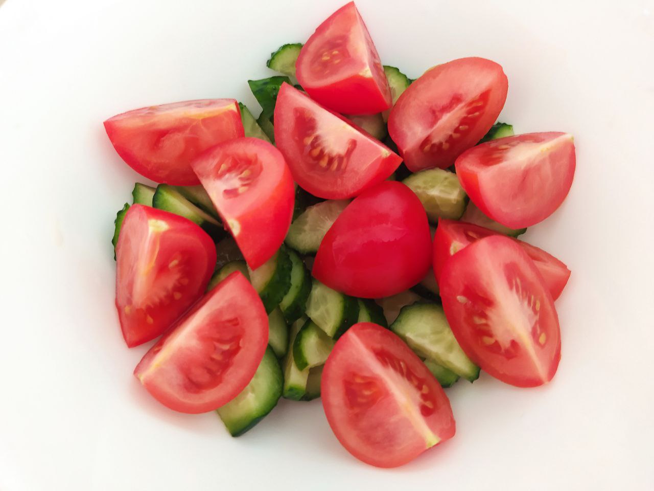 1. Огурец, помидор, салат «Айсберг» нарезать и положить в глубокую ёмкость.