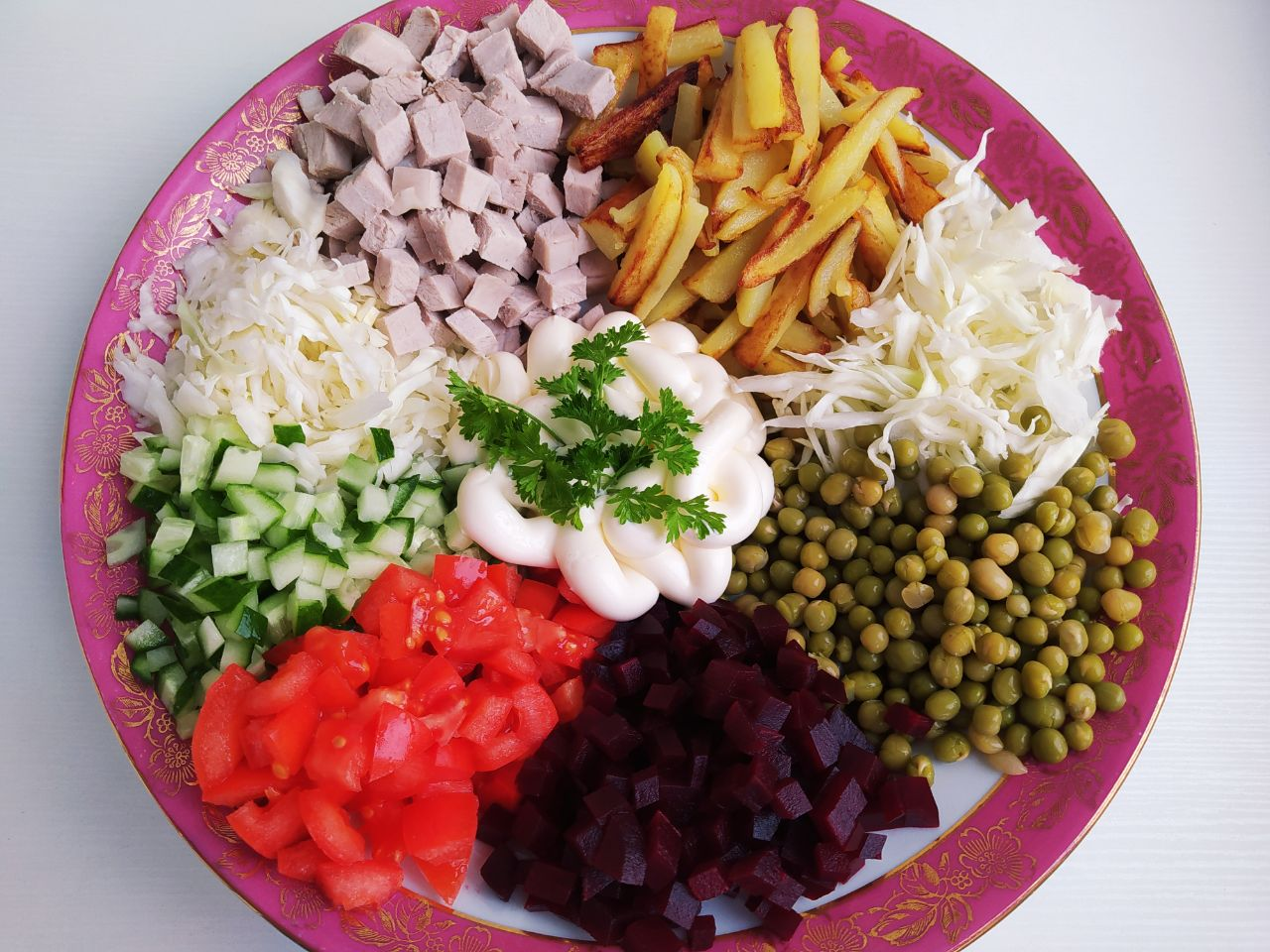 7. В центр блюда налить майонез. Наш салат можно подавать! Перед употреблением в пищу размешать.