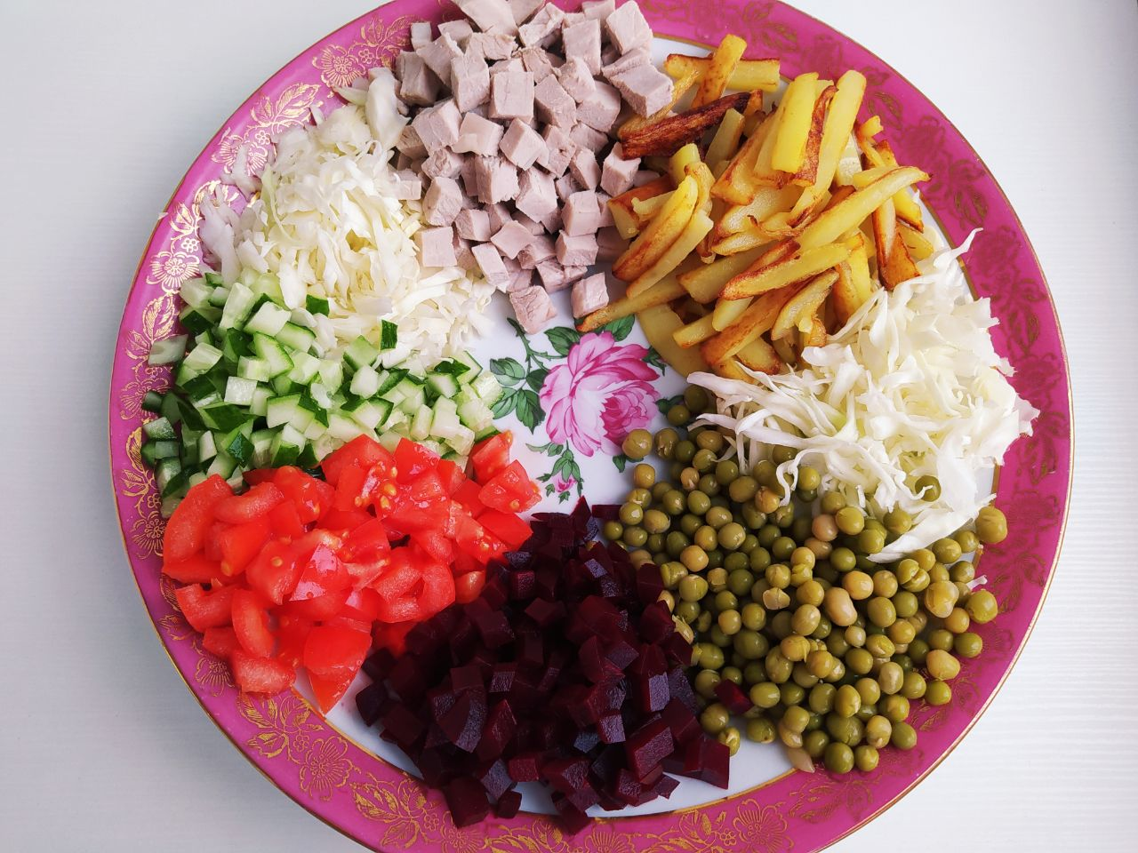 Вам понадобится блюдо средней глубины. Подготовленные ингредиенты будем выкладывать горкой по очереди.
