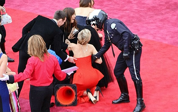 Прославившаяся благодаря главной роли в серии фильмов «Голодные игры» актриса Дженнифер Лоуренс три года подряд «взрывала» светскую хронику своими впечатляющими... падениями. Нет, с карьерой у артистки все нормально. Речь идет о падениях в буквальном смысле. В 2013 году на церемонии вручении «Оскар» артистка запуталась в очень пышном платье и рухнула на ступеньки.