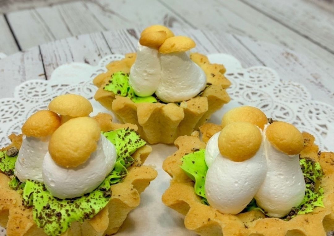 Песочная основа, варенье или повидло, а сверху – «гора» крема и мармеладка. Такие корзиночки продавались на каждом углу. Стоили они недорого, поэтому были очень популярны. Позже в качестве начинки начали использовать и вареную сгущенку. Украшали такие пирожные по-разному – из крема делали цветы различной формы или грибочки.
