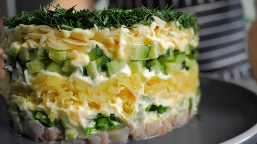 Выложите салат на плоскую тарелку с помощью разъемного кольца. Последовательность слоев такая: