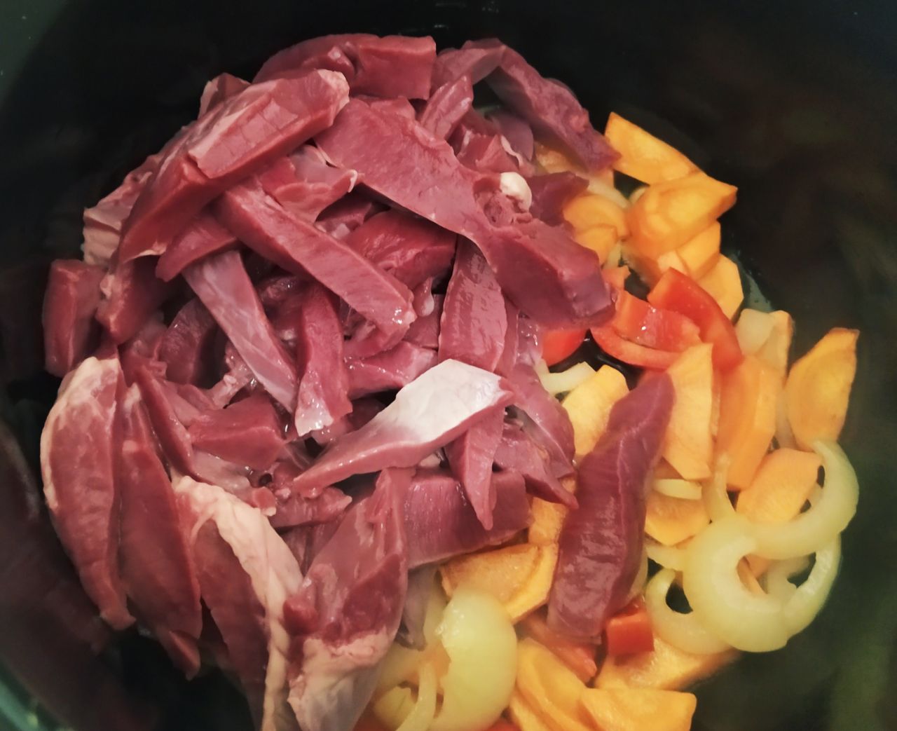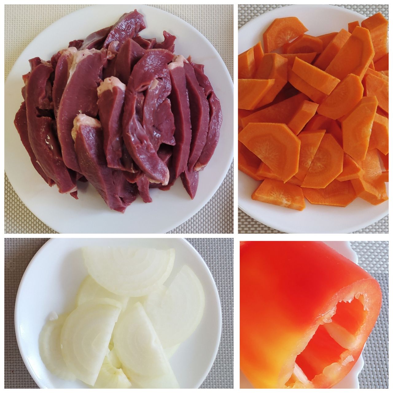 1. Сердце нужно вымочить в холодной воде в течение часа, затем нарезать в произвольной форме. Морковь, лук и перец очистить и крупно нарезать.