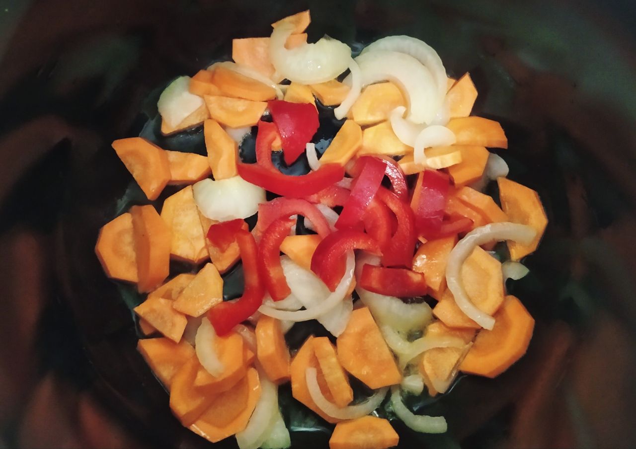 2. В мультиварку выложить морковь, лук и перец. Слегка обжарить.