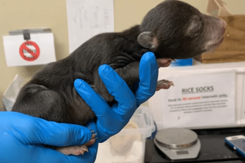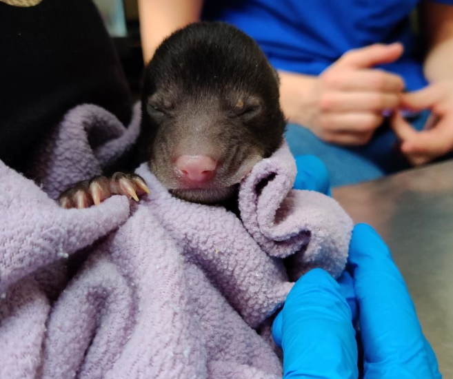 Питомца отправили в Центр дикой природы. По словам специалистов, это самец, он весит почти полкилограмма, ему около двух недель. Медвежонок был немного обезвожен, но сейчас с ним все в порядке.