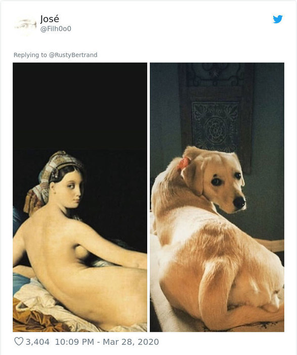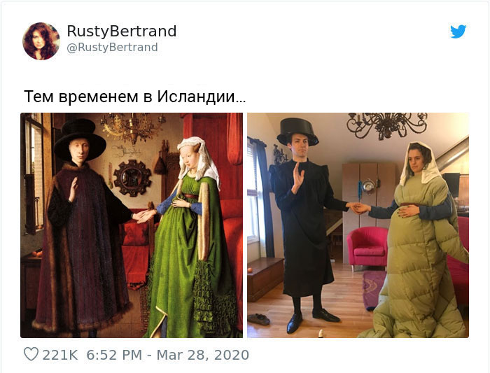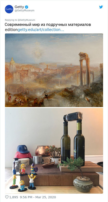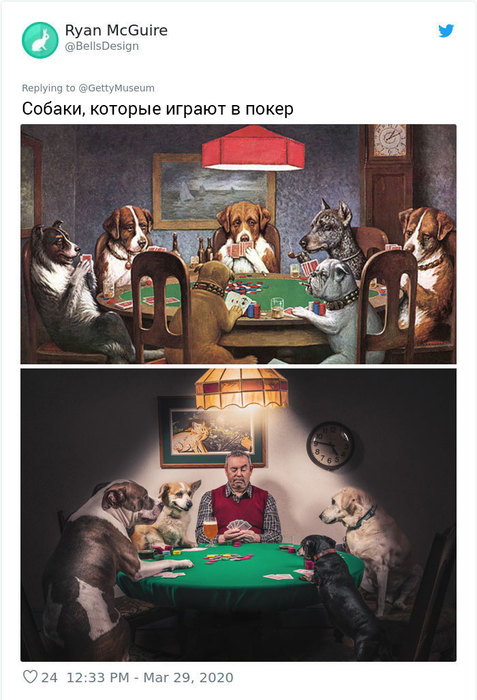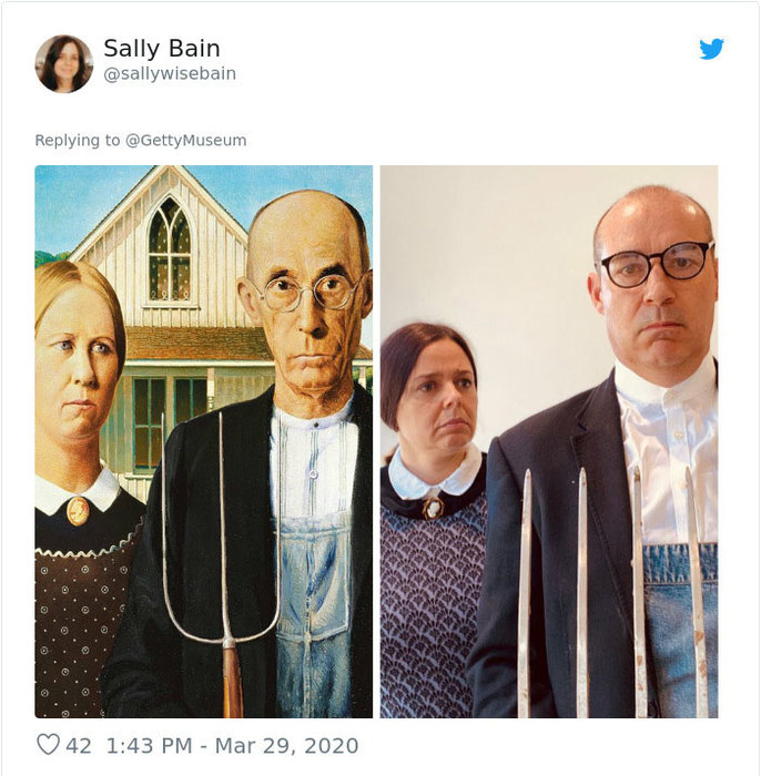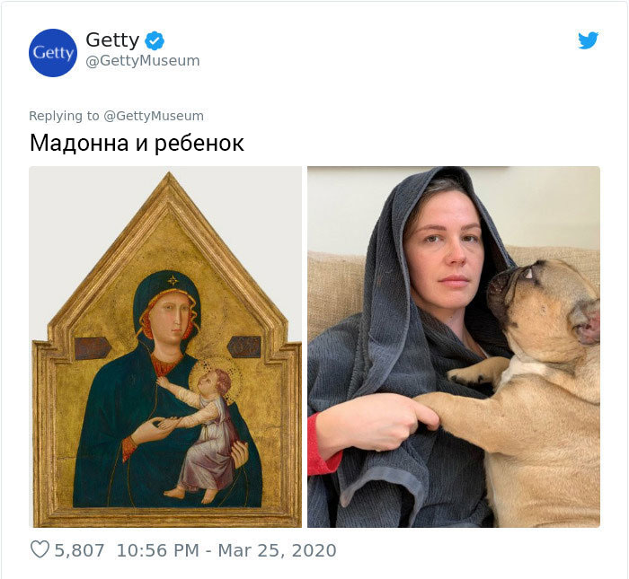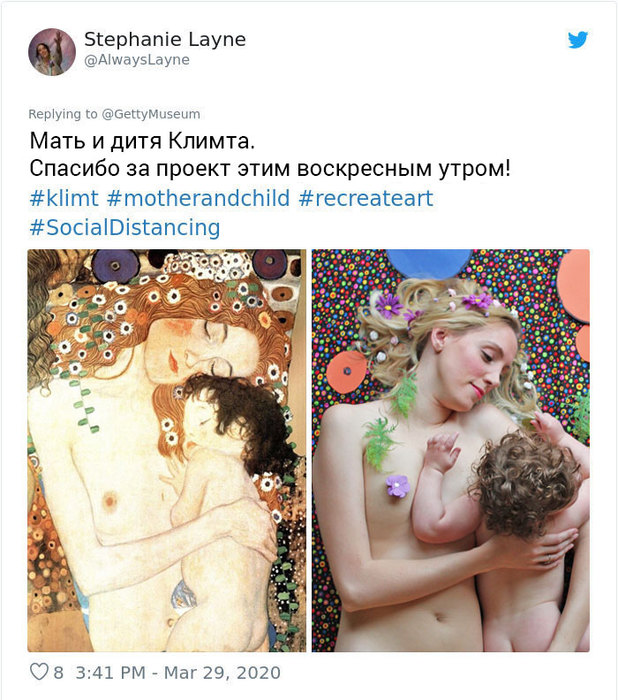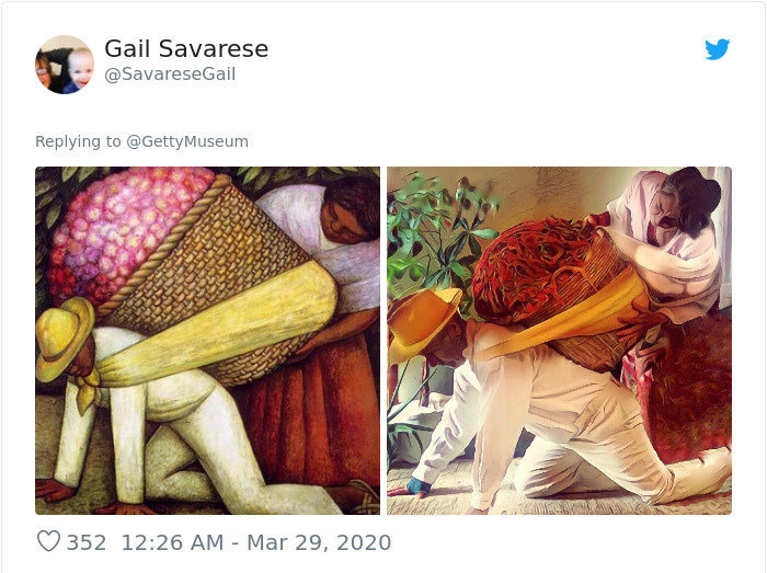 Музей Дж. Пола Гетти в Лос-Анджелесе призвал людей публиковать фотографии в соцсетях, которые копируют их любимые произведения искусства. Люди отреагировали с большим энтузиазмом и стали публиковать десятки собственных репродукций.