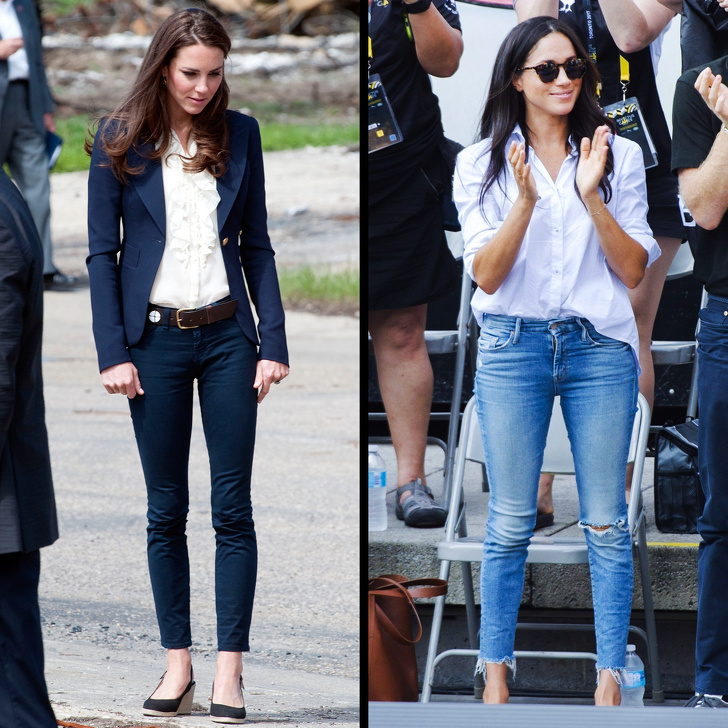 Королевский статус обязывает Кейт придерживаться классического, строгого стиля. У нее десятки разнообразных костюмов как с брюками, так и с юбками. При этом юбки принцесса предпочитает выше колена, а сам образ дополняет жакетами приталенного силуэта. Её примеру следует и Меган.
