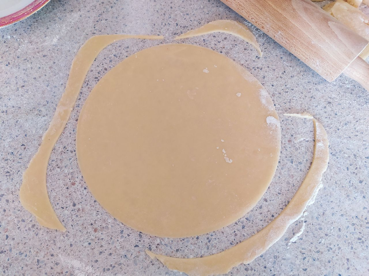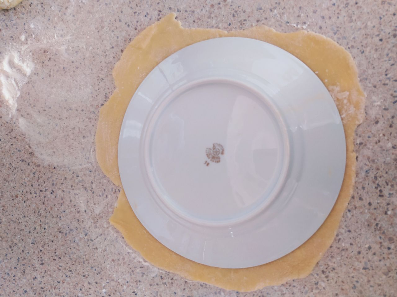 6. Из каждой части раскатать пласт толщиной 3-4 мм. При помощи тарелки диаметром 23 см вырезать круг.
