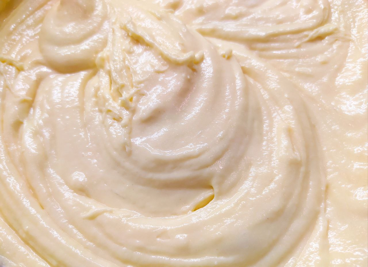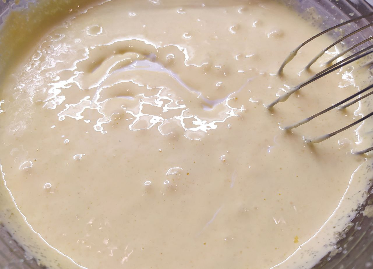 Добавляем сметану, растопленный маргарин. Продолжаем взбивать. Далее кладём муку и соду (погасить). Вымешиваем тесто.
