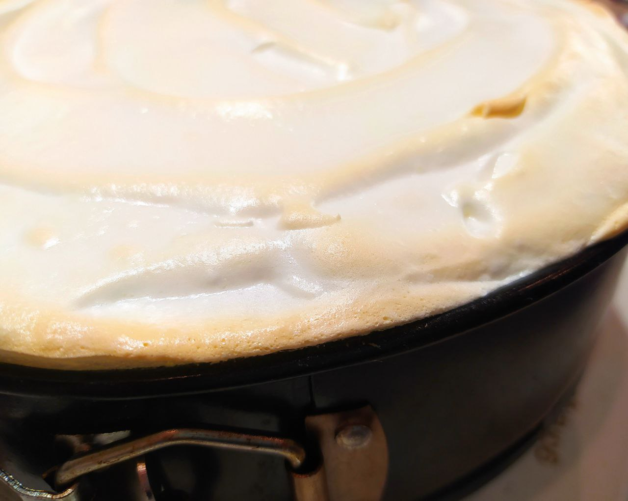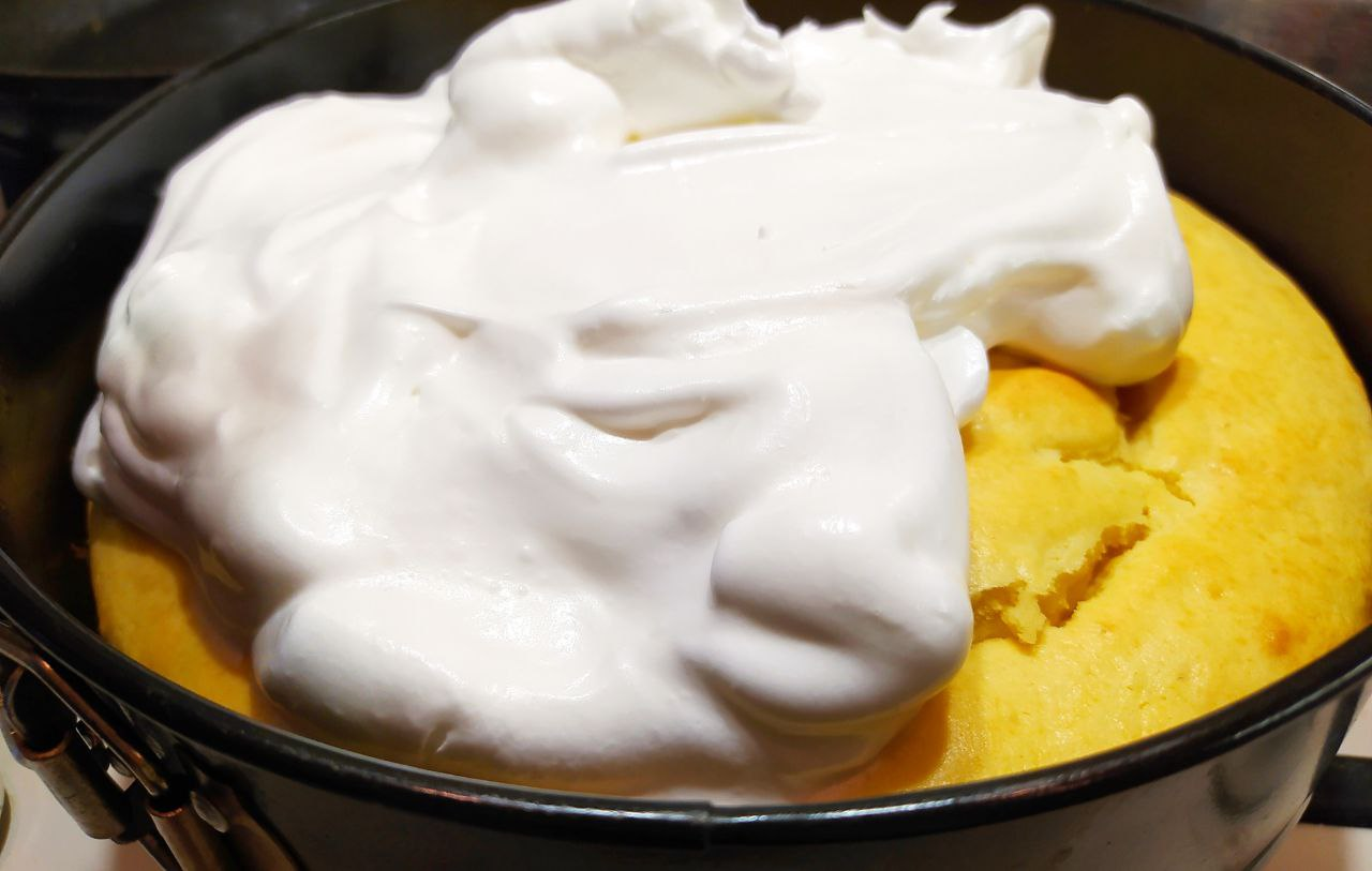 Выкладываем безе на испеченное тесто и снова ставим в духовку. Выпекаем 7–10 минут, пока оно слегка не подрумянится.