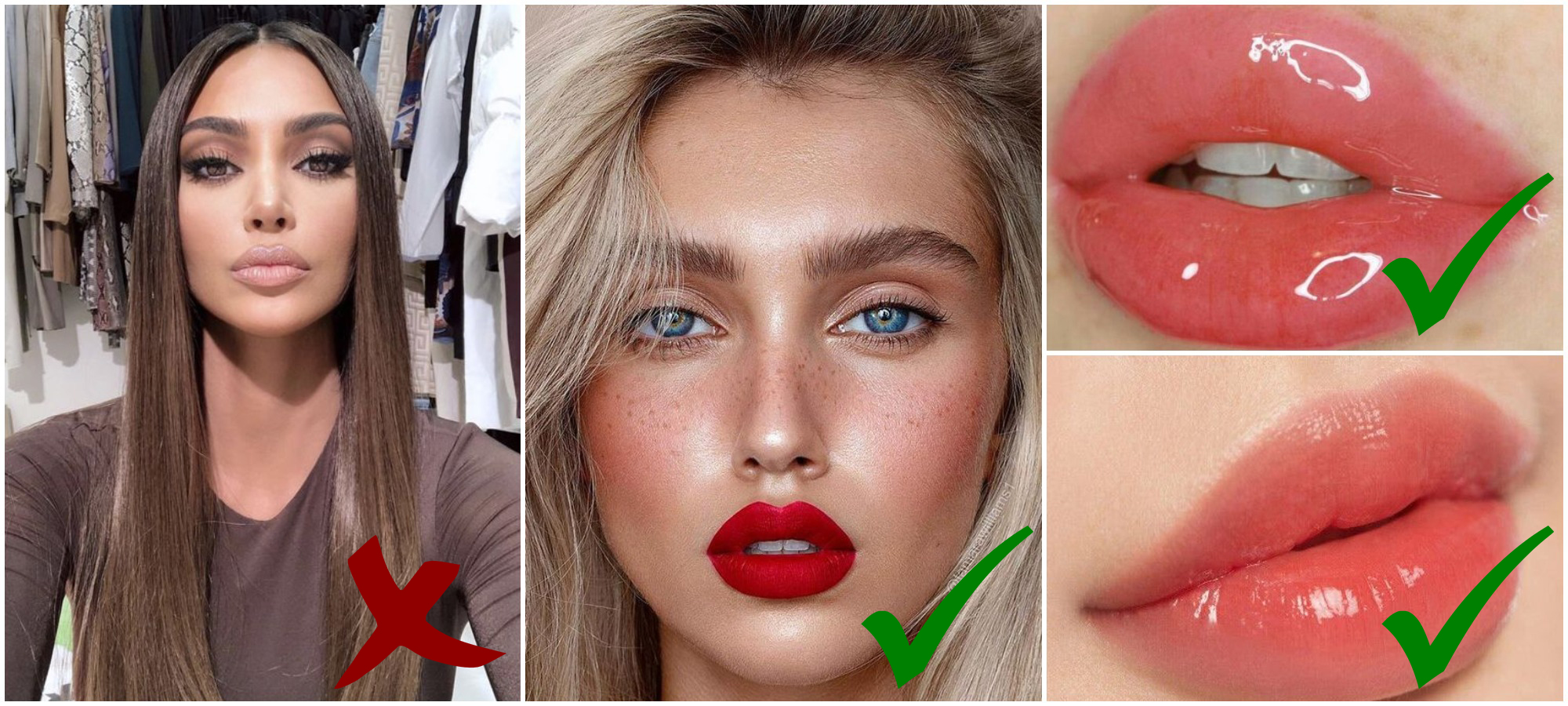 Матовые губы в тон кожи – антитренд, но очень живучий. Возвращаемся к модным тенденциям 2000-х – бежим в магазин за обычным прозрачным блеском и делаем губки «влажными». Либо берем красную помаду и создаем модное сочетание – голая кожа и яркие губы.