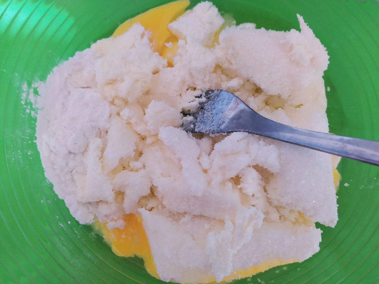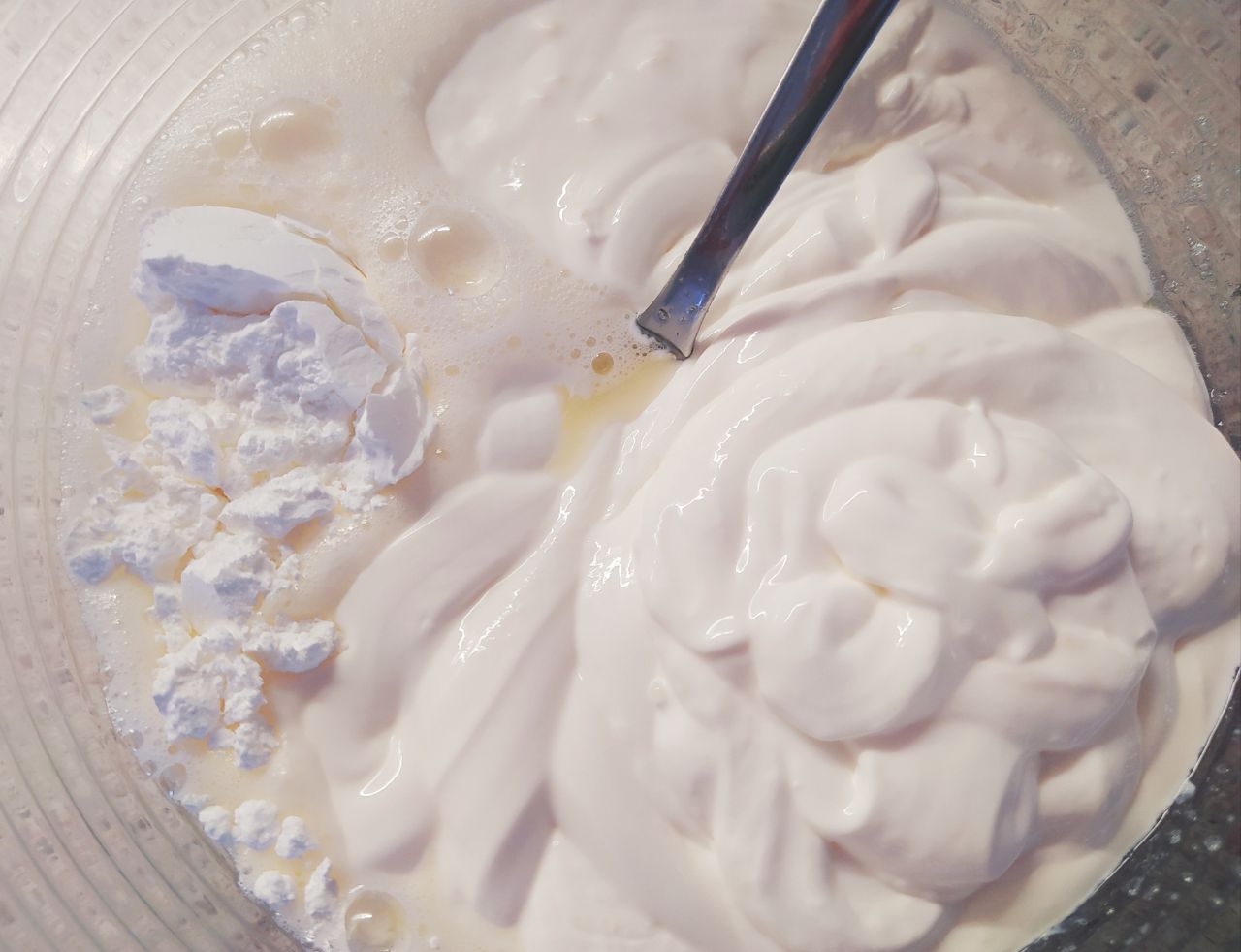 1. Яйцо взбить с сахаром до образования пены, добавить кукурузный крахмал, ванилин и сметану. Хорошенько перемешать.
