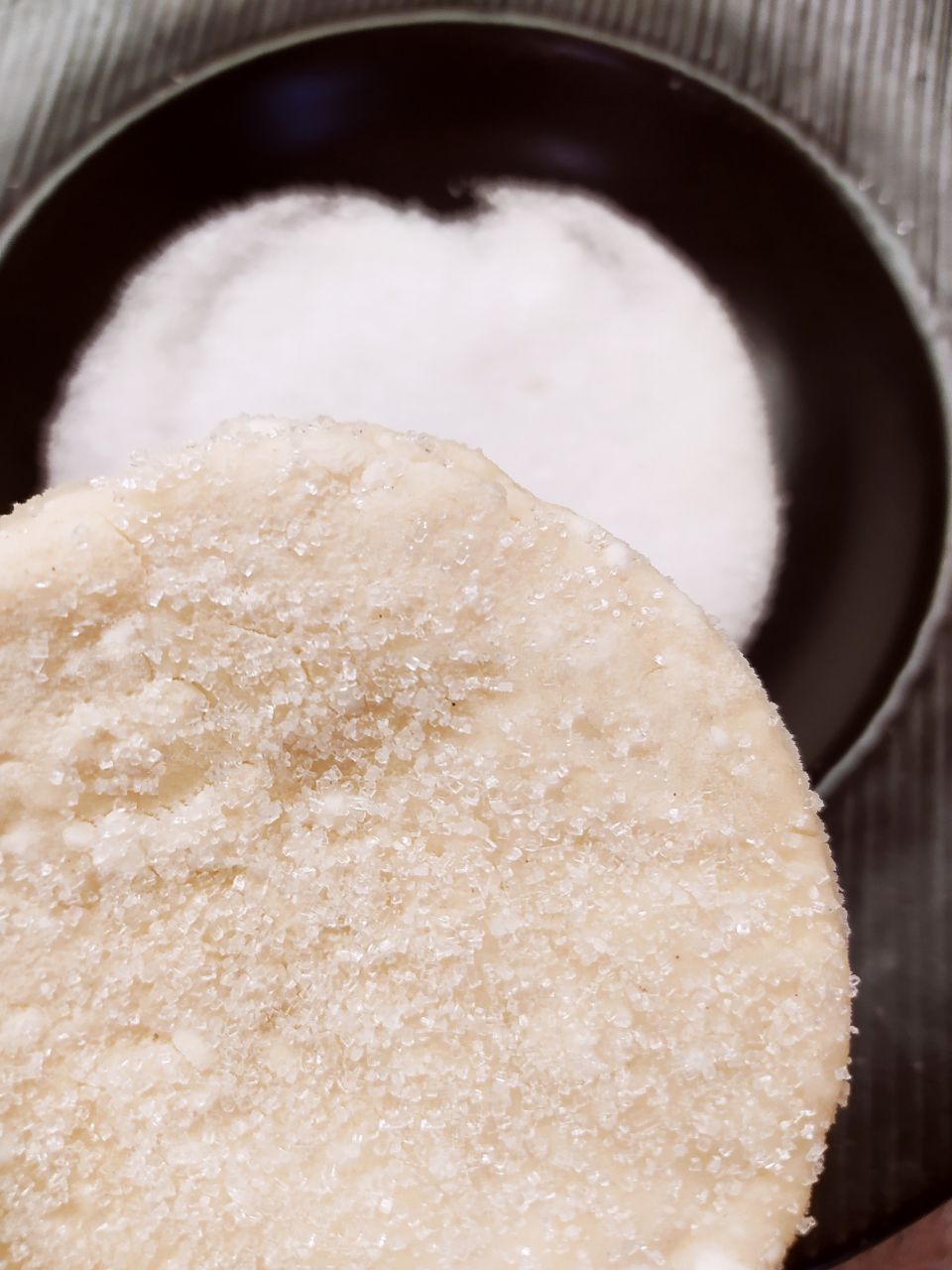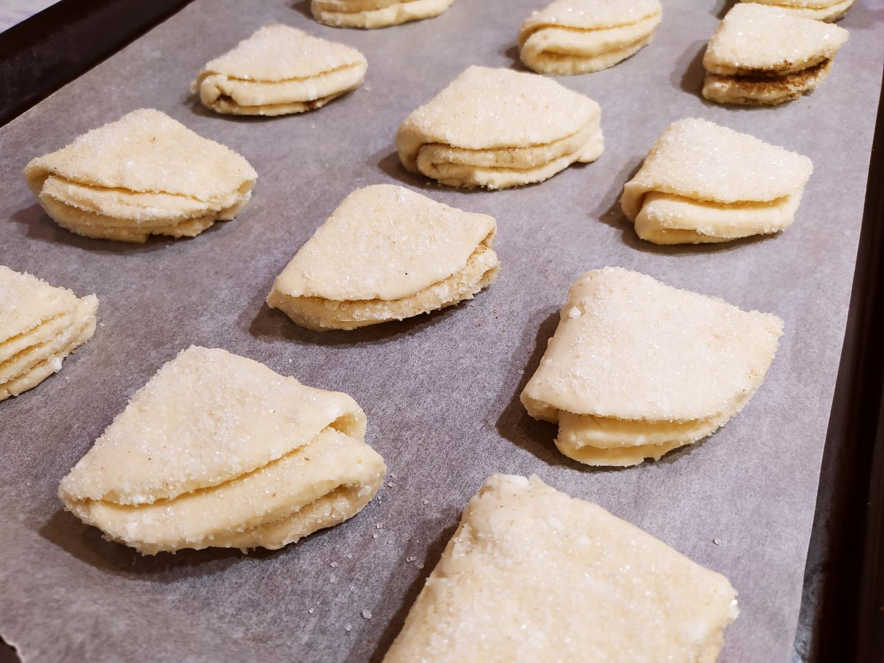 5. Обмакнуть кружочки одной стороной в сахаре. Сложить пополам. Полукруг обмакнуть в сахаре, сложить ещё раз и снова обмакнуть в сахаре.