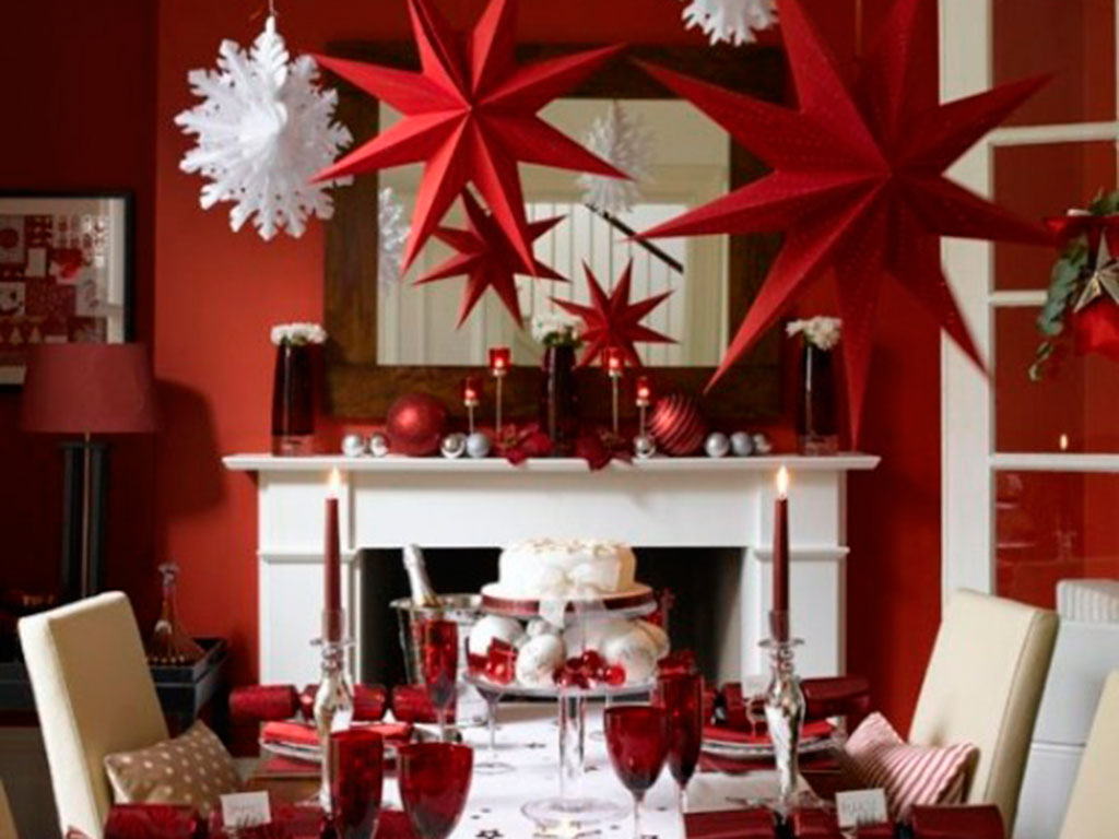 Выбираем золото, блестящие и яркие элементы декора. Главные цвета – серебряный, красный, желтый, коричневый и натуральный зеленый. За основу украшения лучше взять классическую красно-золотую гамму. Гирлянды можно развесить на окнах и потолке. Елка должна сверкать, поэтому украшения выбираем соответствующие. На стенах можно развесить звезды, колокольчики, на дверях – венки с красными ягодами и золотыми лентами. Фигурки с символом года будут удачно смотреться на подоконниках и на праздничном столе.