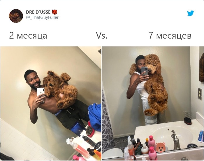 Как быстро растут чужие дети… А собаки еще быстрее! Пройдет всего полгода – и милого маленького щеночка уже не узнать. И происходит это всё так незаметно и быстро, что истинный результат можно оценить только при помощи фото. Пользователь Twitter с ником DRE D’USSÈ решил показать, как за 5 месяцев вырос его щенок по кличке Bear, то есть Медведь. Так и начался невероятно милый флешмоб.