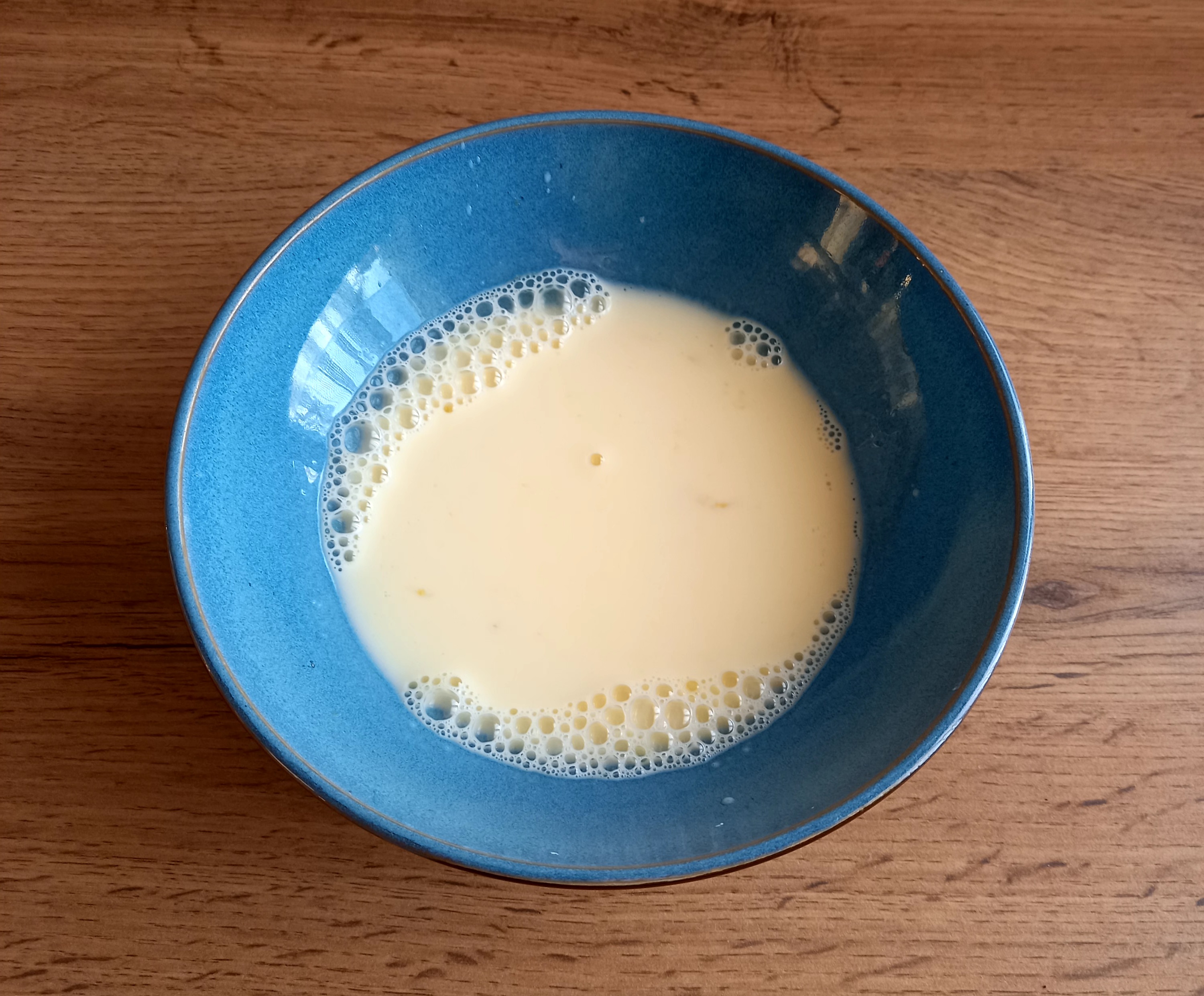 Куриные яйца хорошенько взбить со щепоткой соли. К яичной массе добавить молоко и хорошенько перемешать.