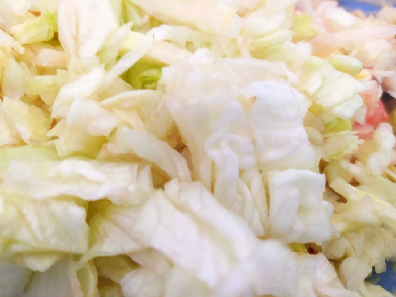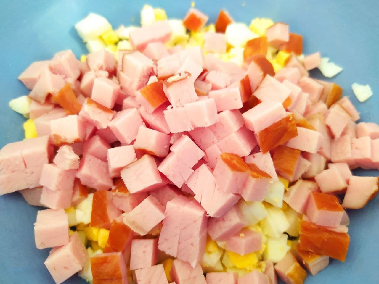 1. Яйца, ветчину, помидор и салат «Айсберг» мелко нарезать и положить в глубокую ёмкость.