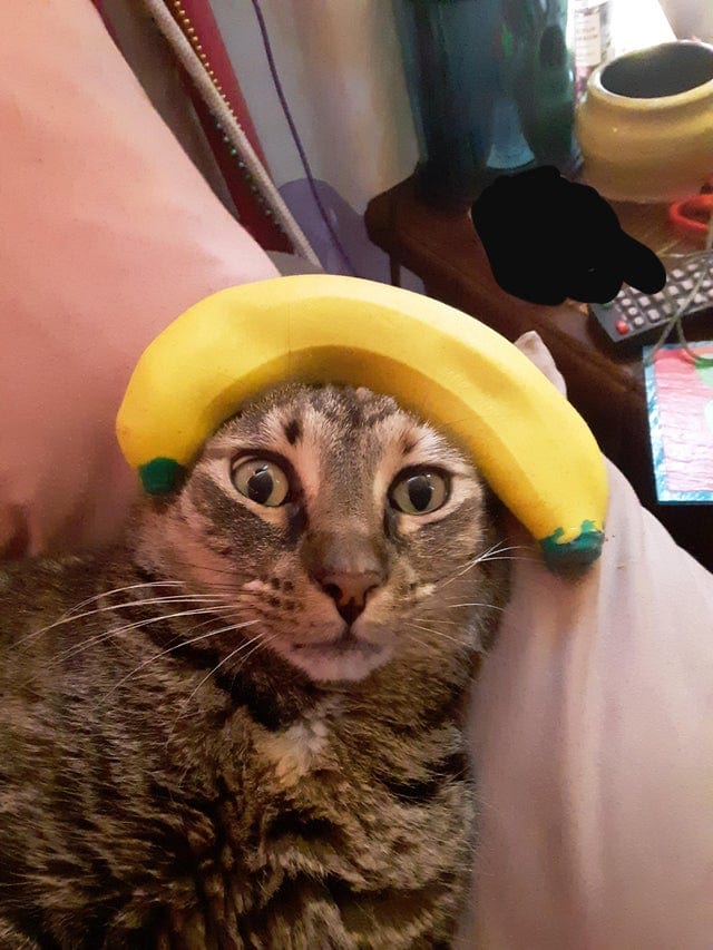 2. А этот кот получил связь с пришельцами с помощью банана на голове.
