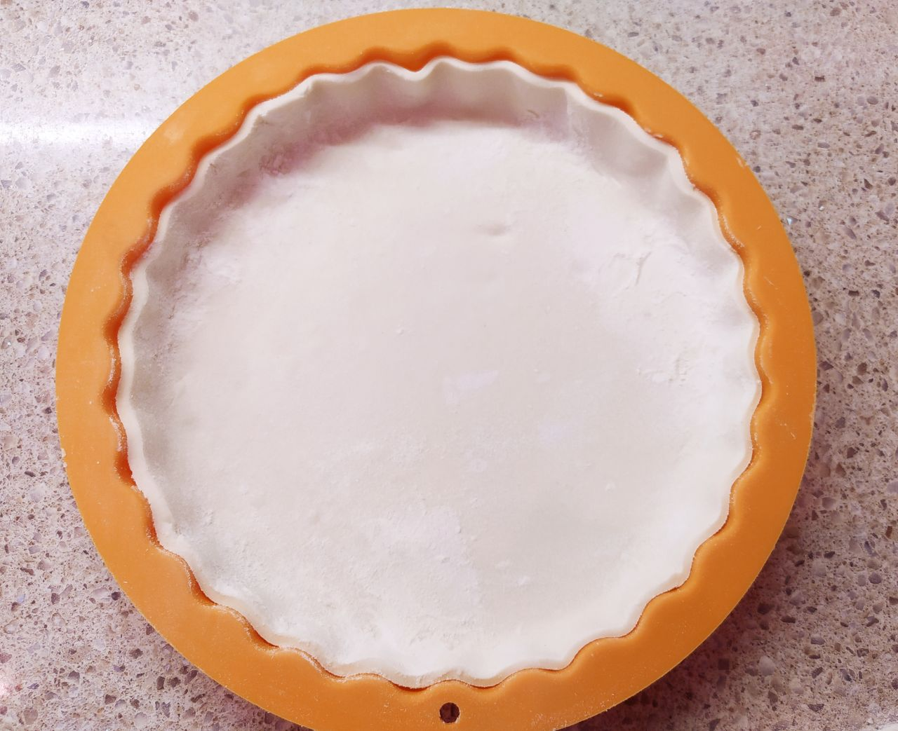 2. Аккуратно раскатать и вырезать круг в соответствии с диаметром формы (на фото – 20 см). В форму выложить тесто, сформировав дно и бортики.