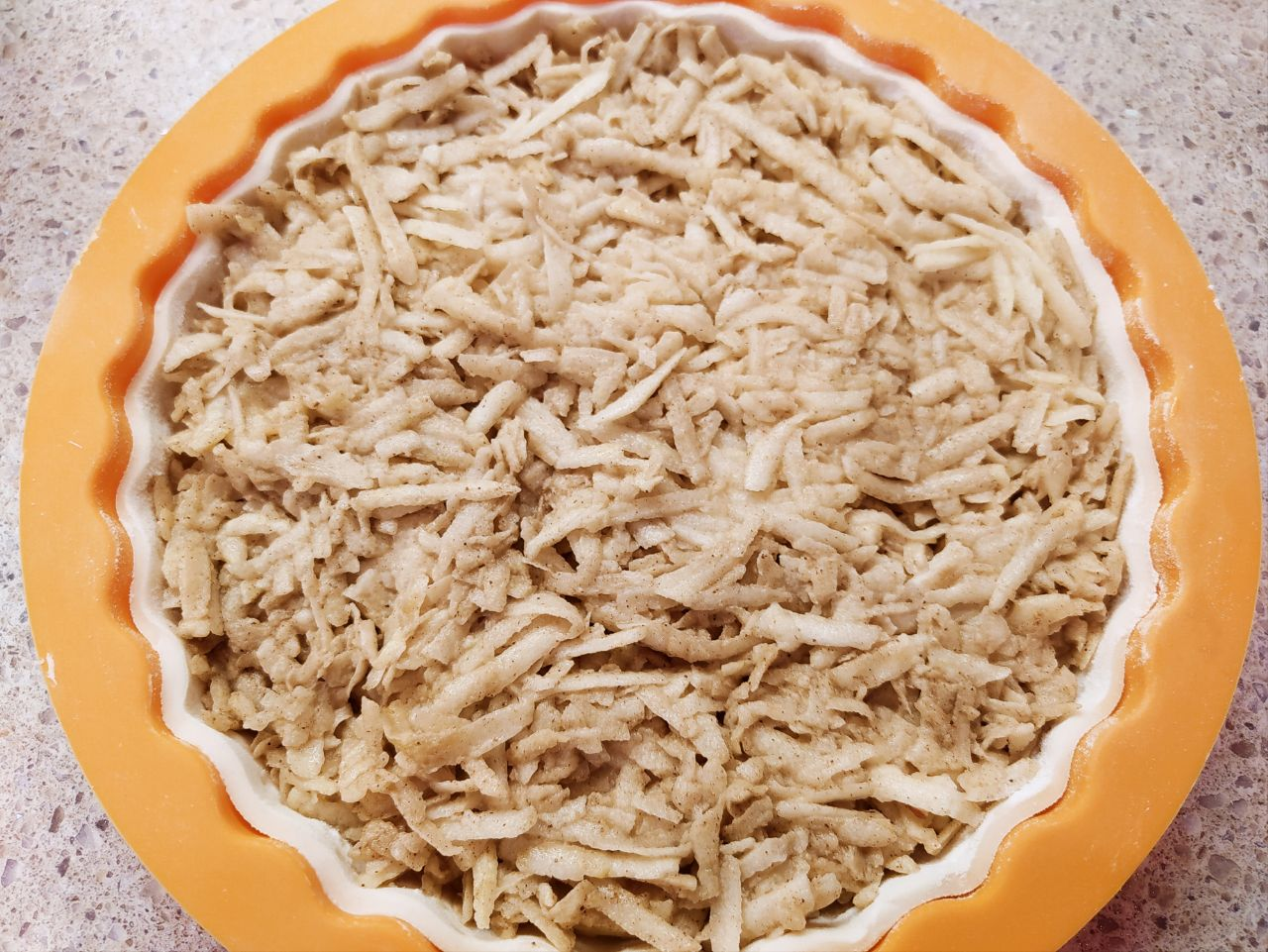 2. Добавить к ним кукурузный крахмал и корицу. Хорошенько перемешать и выложить массу в форму с основой.