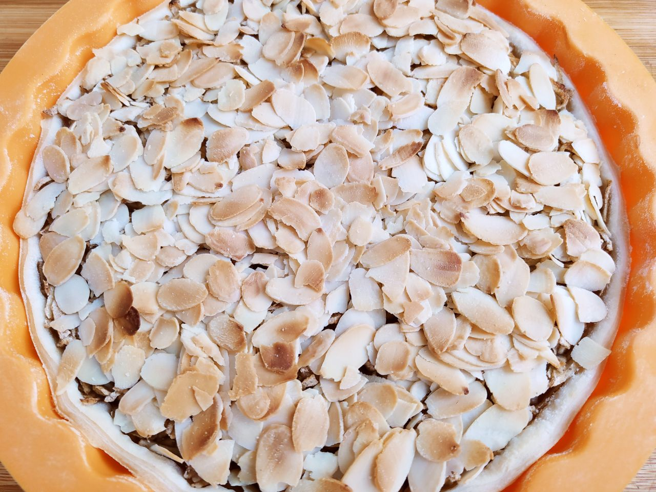 4. Вынуть из духовки, посыпать миндальными хлопьями и выпекать ещё 10 минут.