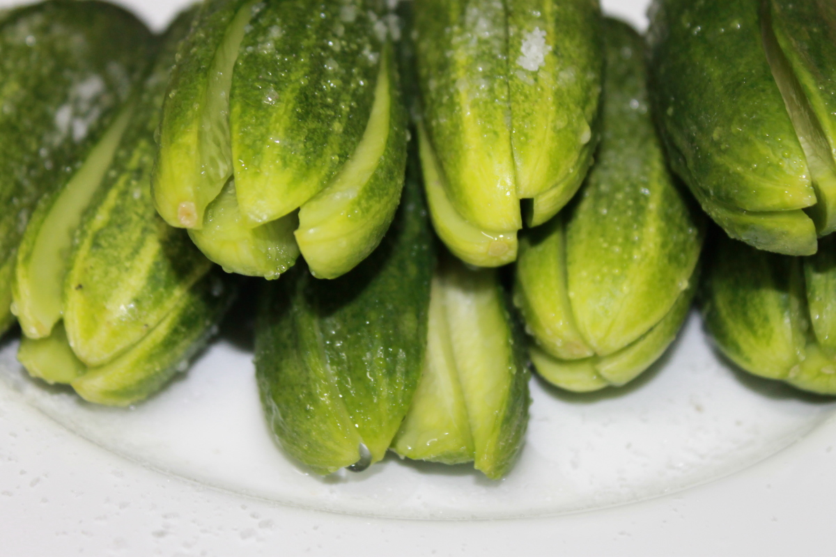 Вымойте 2-3 кг небольших огурцов, отрежьте плодоножку и кончик с обратной стороны, надрежьте каждый огурец крест на крест, но не до конца.