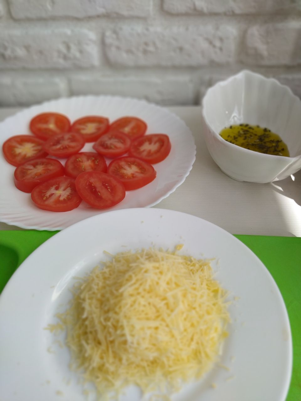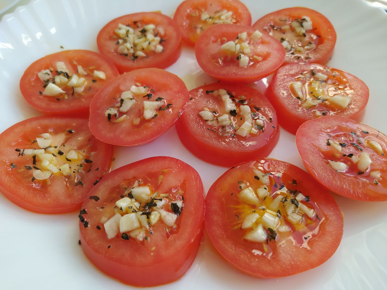 2. Оливкового масла не должно быть слишком много (0.5 ч.л. на каждый кружок помидора);