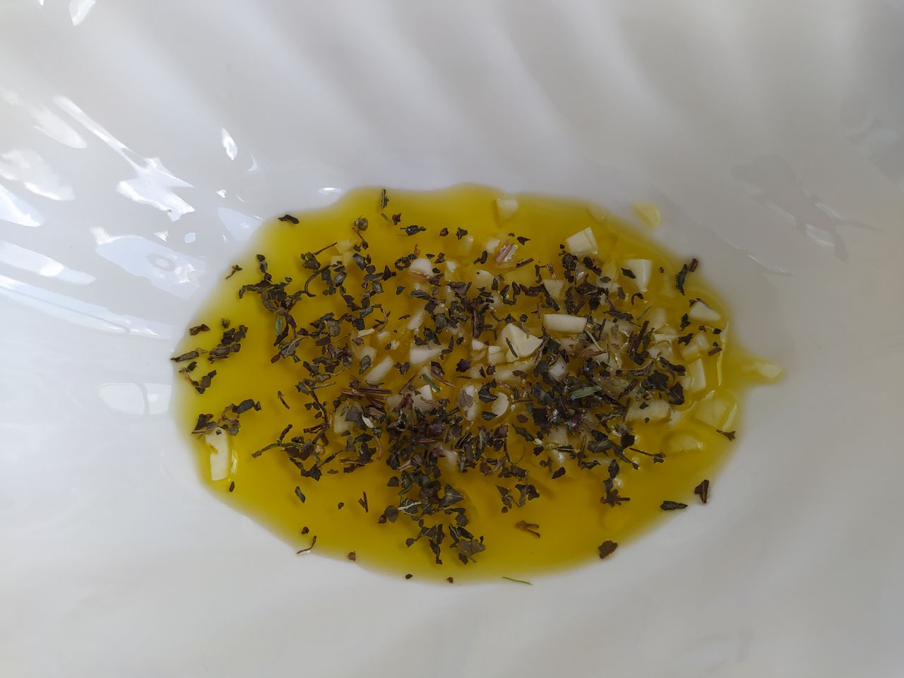 Чеснок мелко порубить, добавить в оливковое масло, туда же щепотку сушёного базилика.