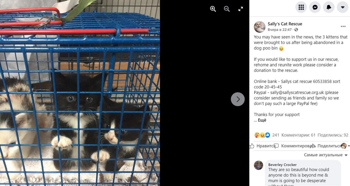 По словам сотрудников Sally’s Cat Rescue, котят выбросили не для того, чтобы их кто-то спас. Команда приюта сейчас пытается найти мать котят, потому что они еще очень маленькие, чтобы жить без мамы.