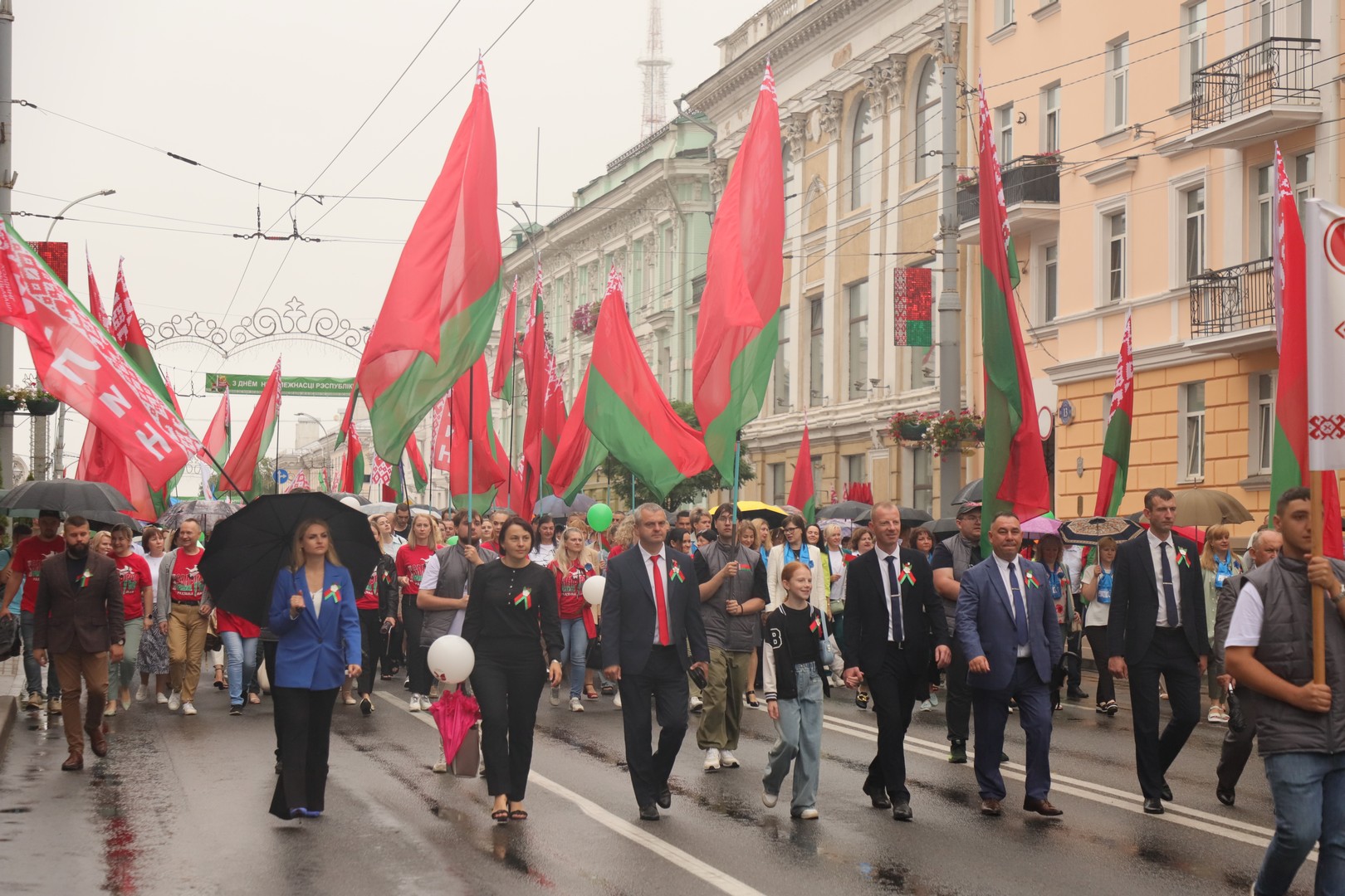 В Гомеле празднование Дня Независимости Беларуси стартовало с шествия ветеранов, трудящихся, спортсменов и творческой молодежи по улице Советская. Несмотря на непогоду, тысячи гомельчан присоединились к торжеству.