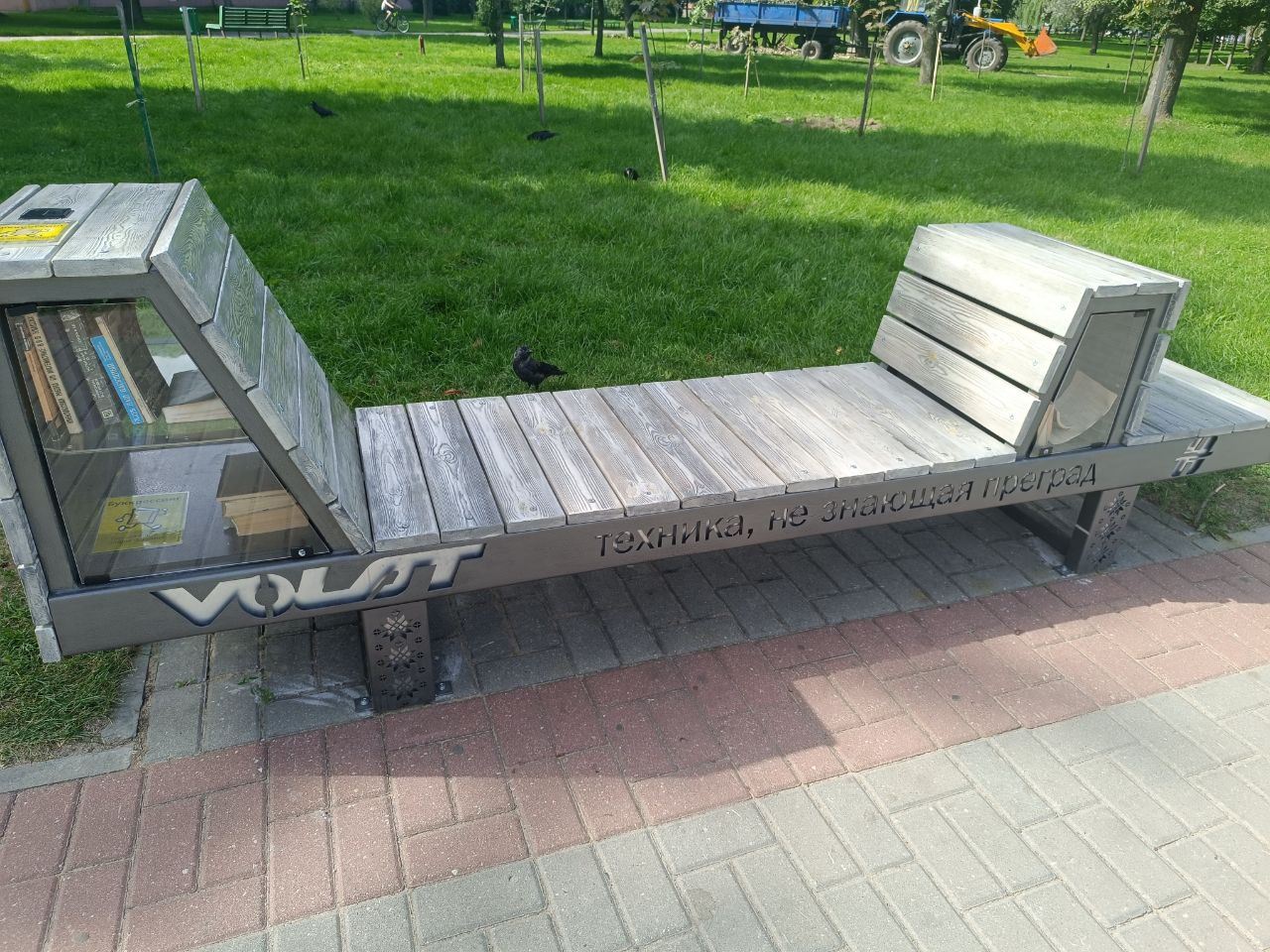 Но больше всего, пожалуй, впечатлила скамейка филиала «Автосборочный завод "Неман"» ОАО «Минский завод колесных тягачей». Она изображена в виде грузовика, кабина и задняя часть которого выполнены в виде стеклянных ящиков, в которые любители буккроссинга смогут складывать книги. Вот это действительно намек на День белорусской письменности!