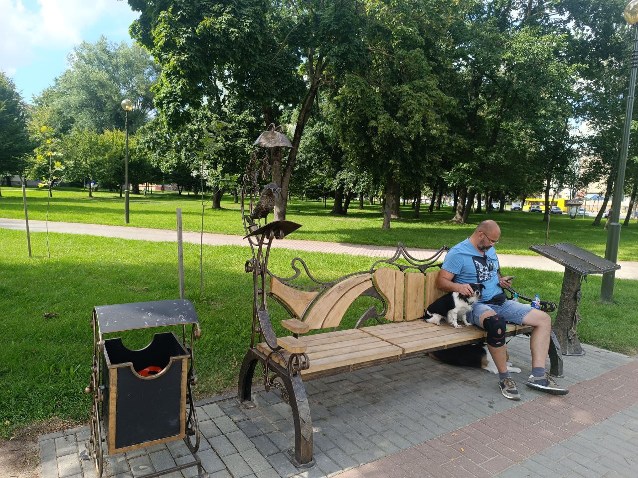 Шедевр от предприятия «Конус» словно «охраняет» рыцарь. Если быть точнее, рыцарем может стать каждый желающий, так как рядом со скамейкой от этой организации предусмотрена и фотозона.