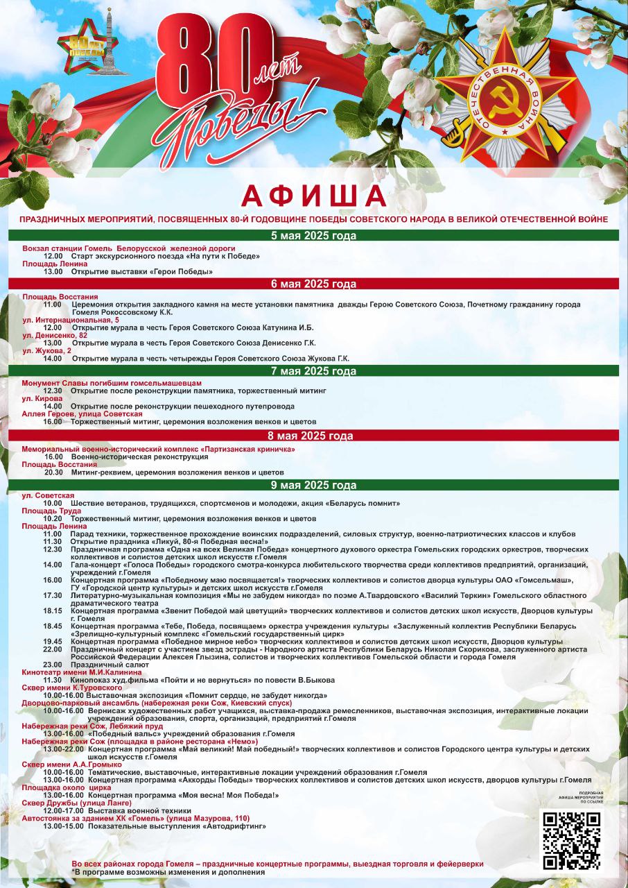 В Гомеле, как и в других областных городах, подготовили насыщенную праздничную программу в честь 80-летия Победы в Великой Отечественной войне. Самым ярким мероприятием будет, пожалуй, вечерний концерт с участием российского певца Алексея Глызина. Что еще интересного в программе?
