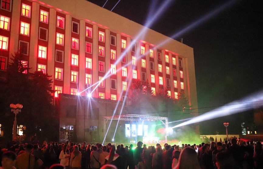 С 20:00 началось выступление диджеев, которое прервалось для одного из самых запоминающихся элементов праздника – светового шоу. При этом формат был выбран весьма необычным. Здание Гомельского медуниверситета превратилось в огромное световое табло, где роль «пикселей» выполняли окна здания, которые загорались разными цветами, создавая различные надписи и изображения.