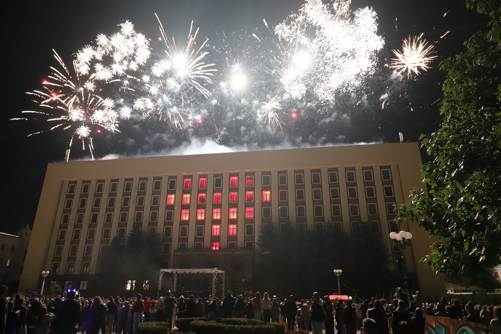 Праздник, проходивший 14 сентября, также завершился фейерверком, который взмыл в небо над зданием медуниверситета. При этом огненное шоу было совмещено со световым шоу.