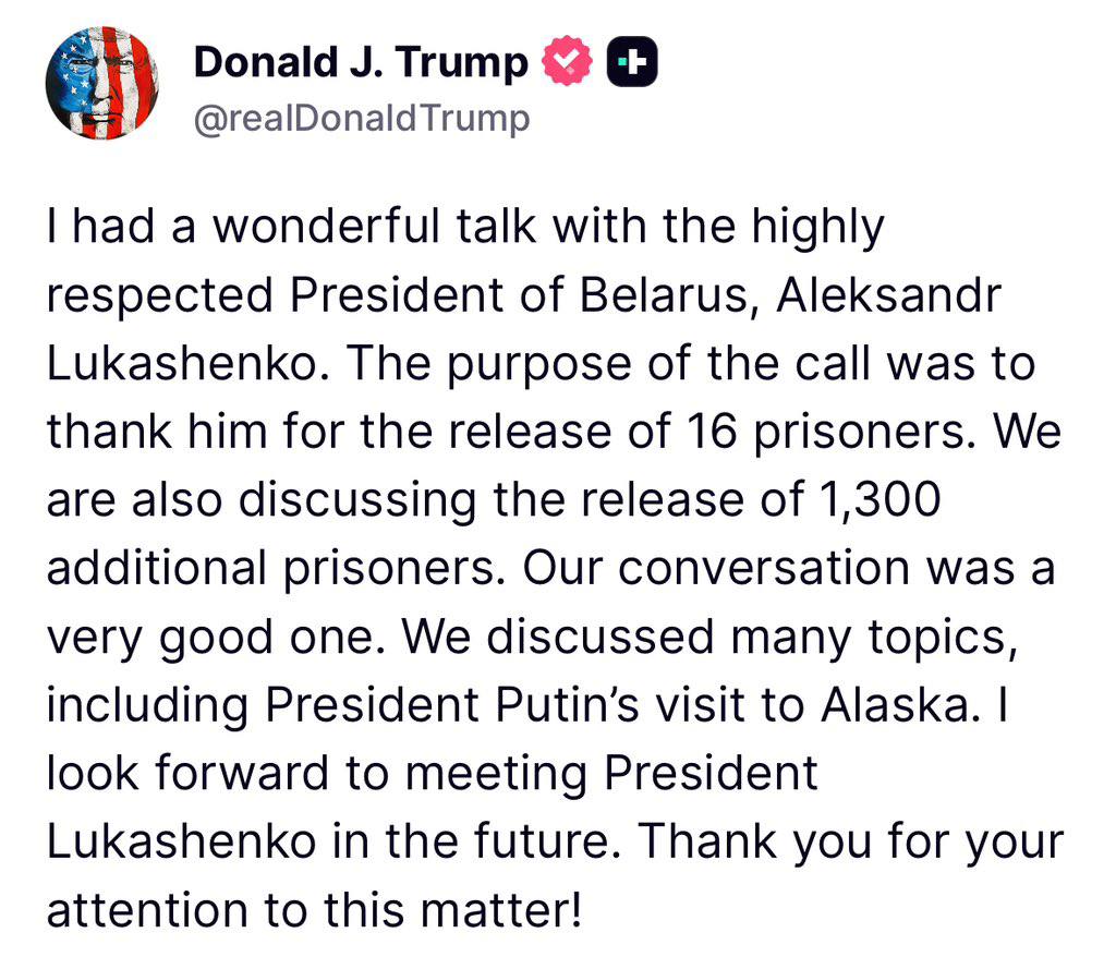 У меня был замечательный разговор с глубокоуважаемым президентом Беларуси Александром Лукашенко. Целью звонка было поблагодарить его за освобождение 16 заключенных. Мы также обсуждаем освобождение 1,300 дополнительных заключенных. Наш разговор был очень хорошим. Мы обсудили многие темы, включая визит президента Путина на Аляску. Я с нетерпением жду встречи с президентом Лукашенко в будущем. Спасибо за ваше внимание к этому вопросу!