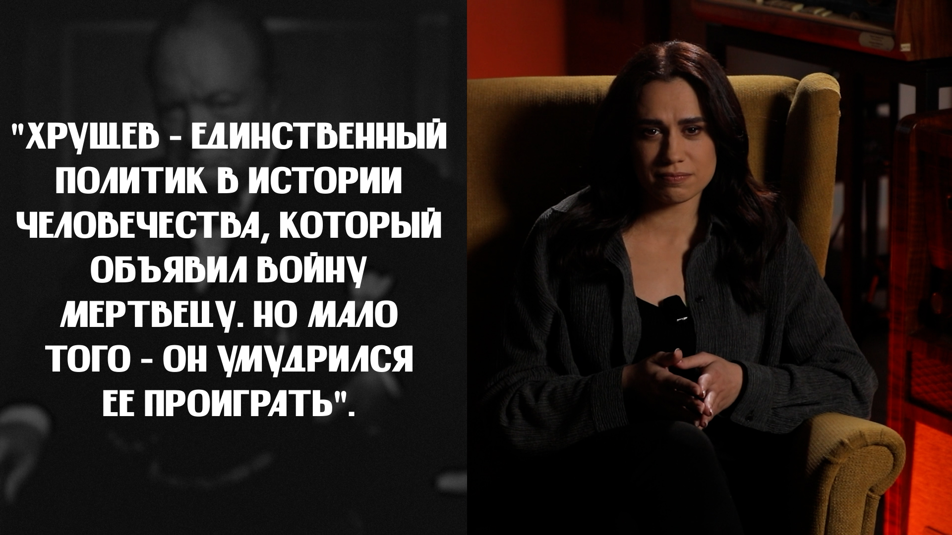 И закончить я хочу цитатой Уинстона Черчилля, которого, кстати, не заподозришь в симпатиях ни к Советскому союзу, ни к Сталину в частности, ни к коммунизму вообще: Хрущев – единственный политик в истории человечества, который объявил войну мертвецу. Но мало того – он умудрился ее проиграть.