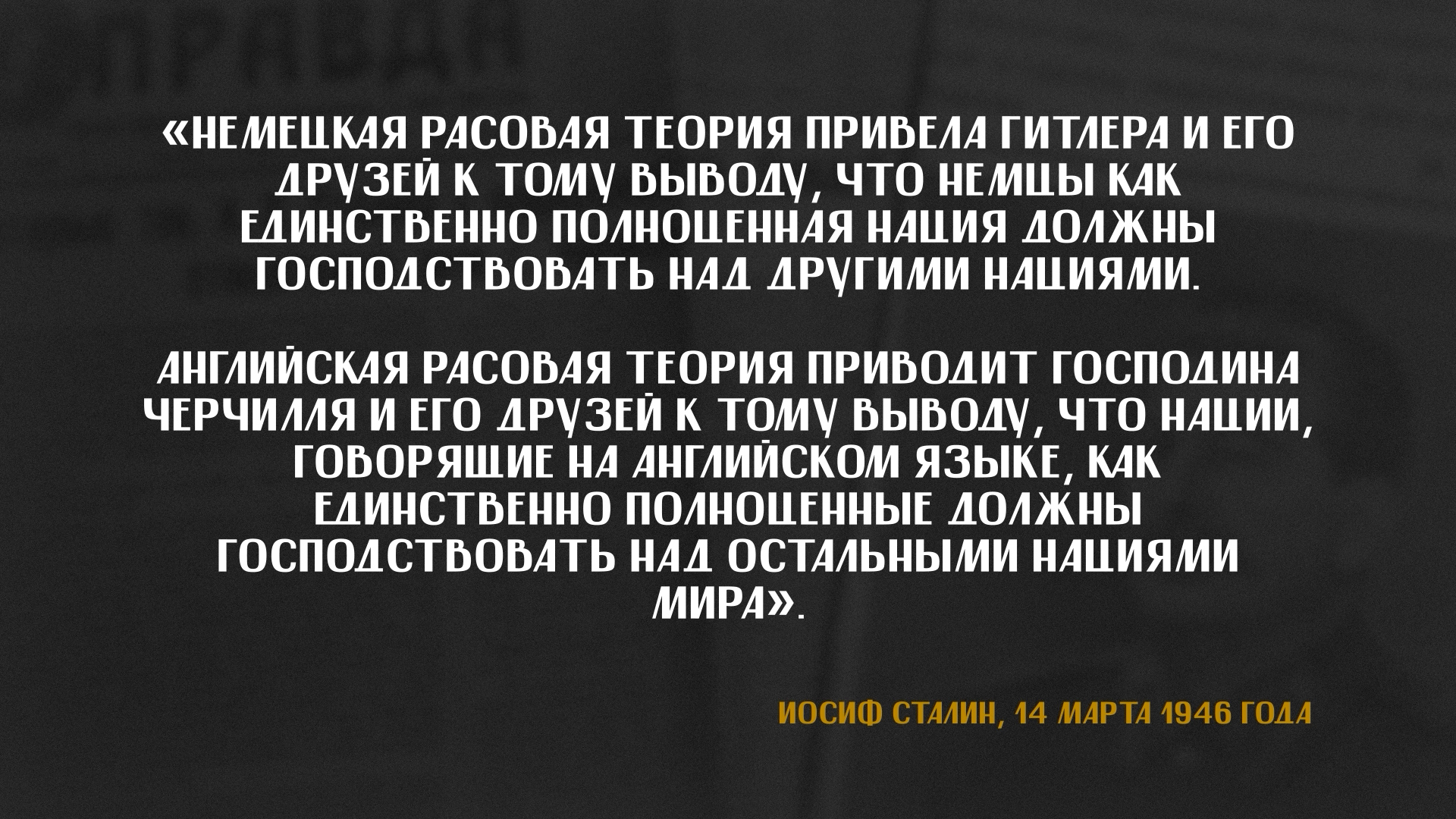 «Немецкая расовая теория привела Гитлера и его друзей к тому выводу, что немцы как единственно полноценная нация должны господствовать над другими нациями. Английская расовая теория приводит господина Черчилля и его друзей к тому выводу, что нации, говорящие на английском языке, как единственно полноценные должны господствовать над остальными нациями мира».