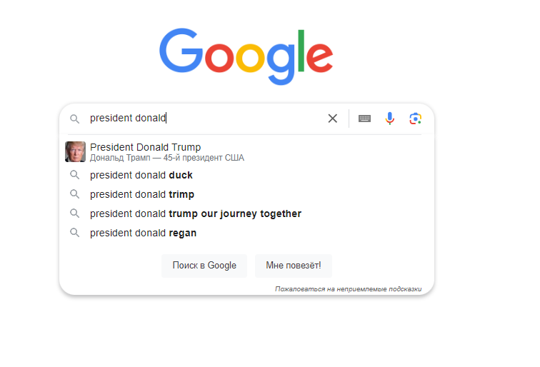 Стоит отметить, что в русскоязычной версии поиска Дональд Трамп все же указан как «45-й президент США». Впрочем, если ввести словосочетание «президент Дональд» на русском языке, то подсказок вариантов вообще не будет, словно пользователь пытается найти что-то, что может быть запрещено или иметь ограничения (например «порно», «изготовление бомбы» и другие сомнительные запросы).